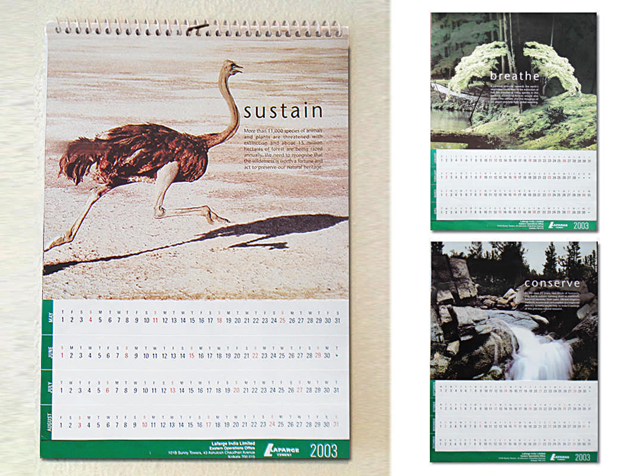 The 2003 Lafarge calendar presents the threat to the planet’s ecosystem in three full colour pages that serve to discuss the effects of climate change on the planet. Seek More