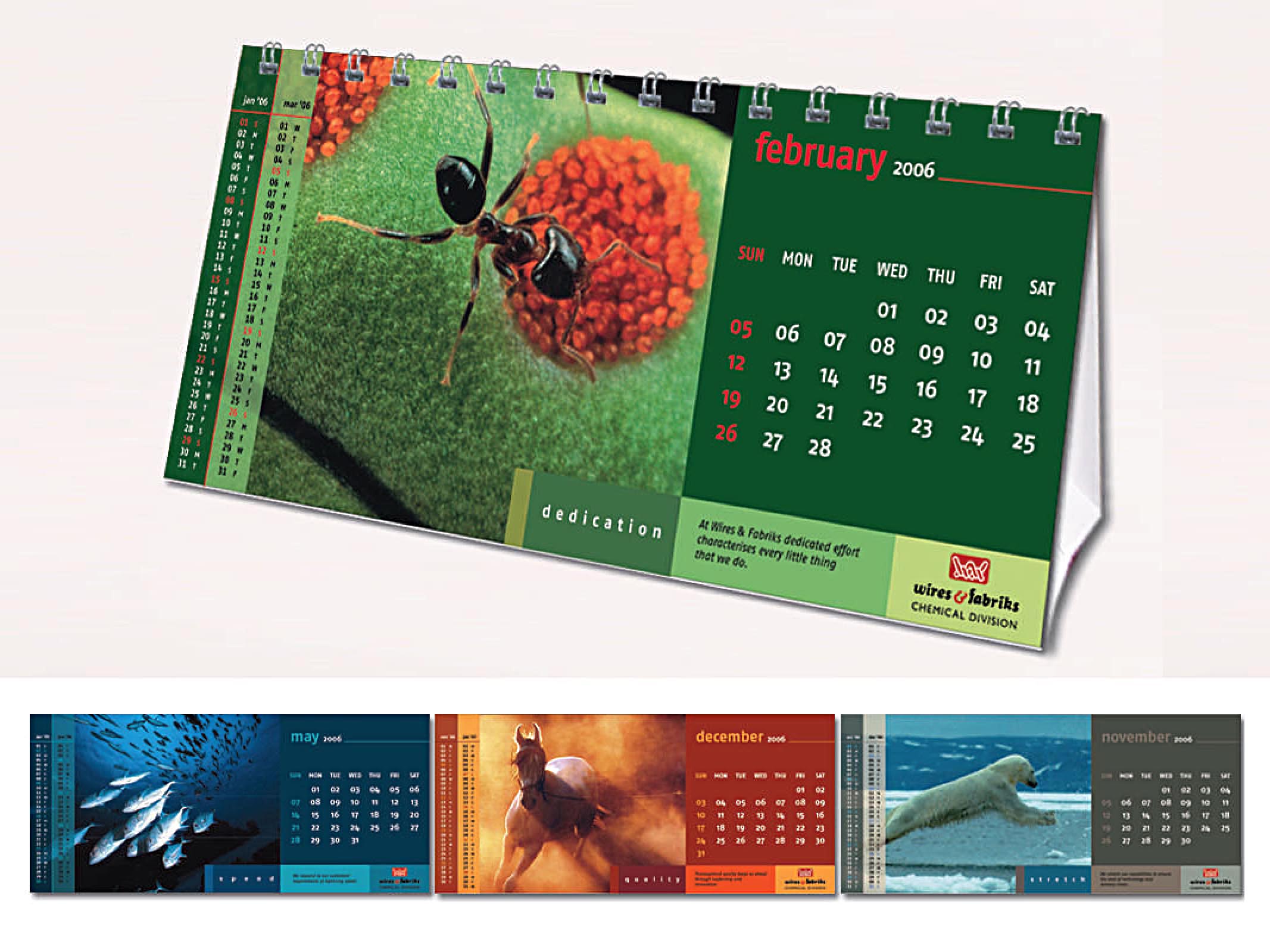 Headquartered in Jaipur, Wires & Fabriks Ltd is the leading manufacturer and supplier of paper machine clothing in India. The 2006 calendar that was created for it used the theme of wildlife and each page expounded the particular positive quality of a species in a resonance of the values that the Company holds dear.
