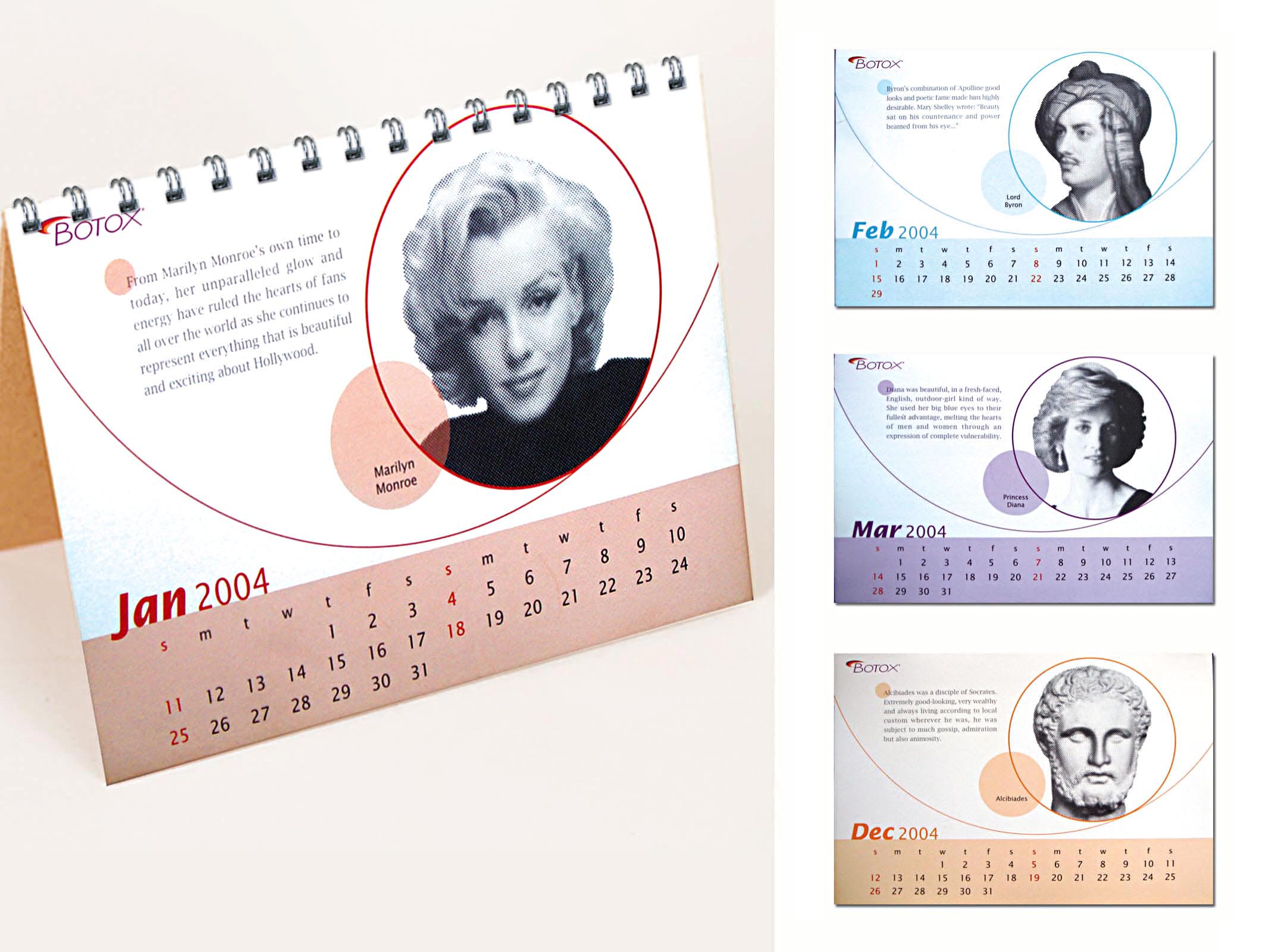 Botox is an American brand used in the cosmetic treatment of frown lines and wrinkles. The 2004 calendar for it recognises beauty as the essential quality of universal human nature. It does this by paying tribute to good looking people throughout history, such as Marilyn Monroe, James Dean, Gary Cooper etc.