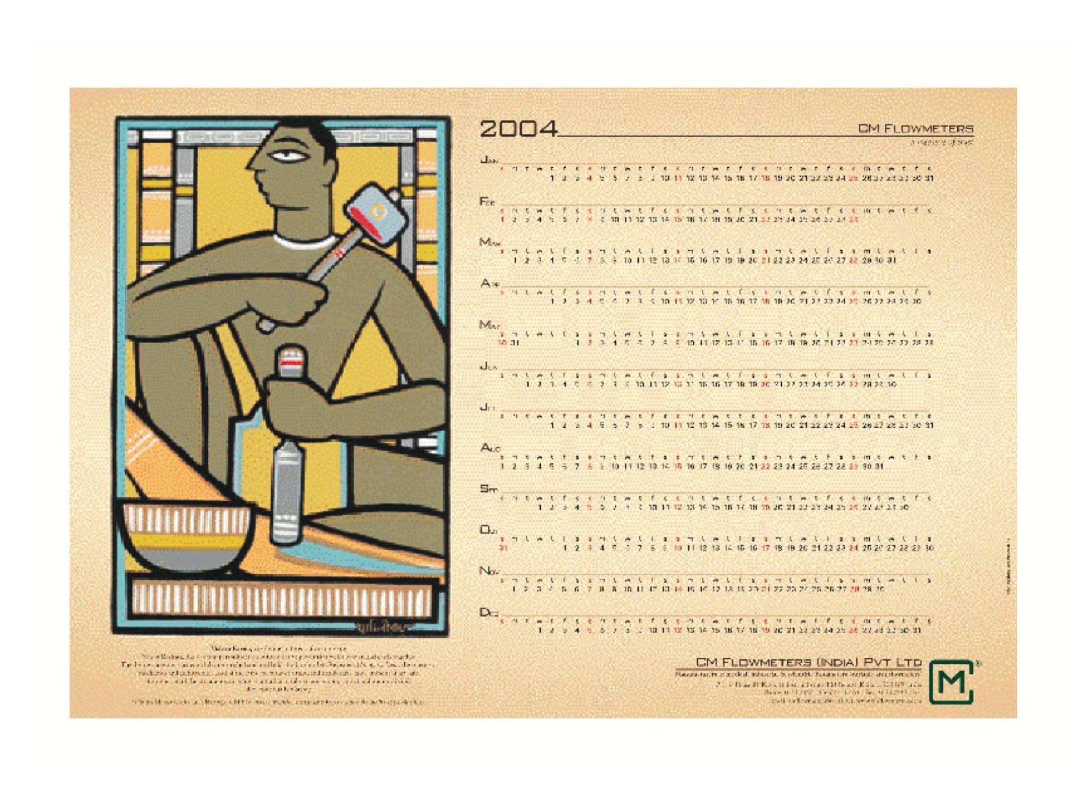 CM Flowmeters manufactures gauges to measure oxygen in pathological applications and gas delivery in diverse applications. The task was to create a calendar that would flag hard work without being overtly industrial, but yet be easy on the eye. The result, a calendar that showed Vishwakarma, the Hindu god of artisans, using a folk art technique.