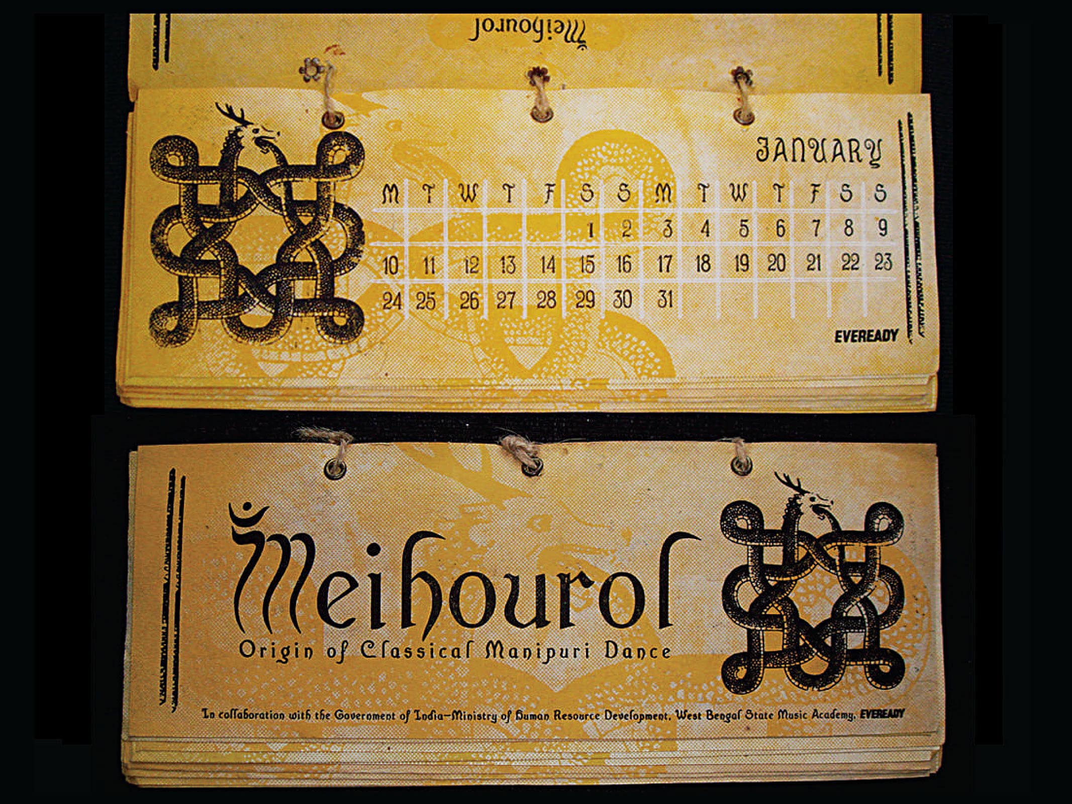 This calendar as created for Anjika. It was given as a gift at an event called Meihourol, conducted jointly by it and the Government of India—Ministry of Human Resource Development. The symbol on the cover was created specifically for Meihourol and continued throughout the pages of the calendar. Seek More