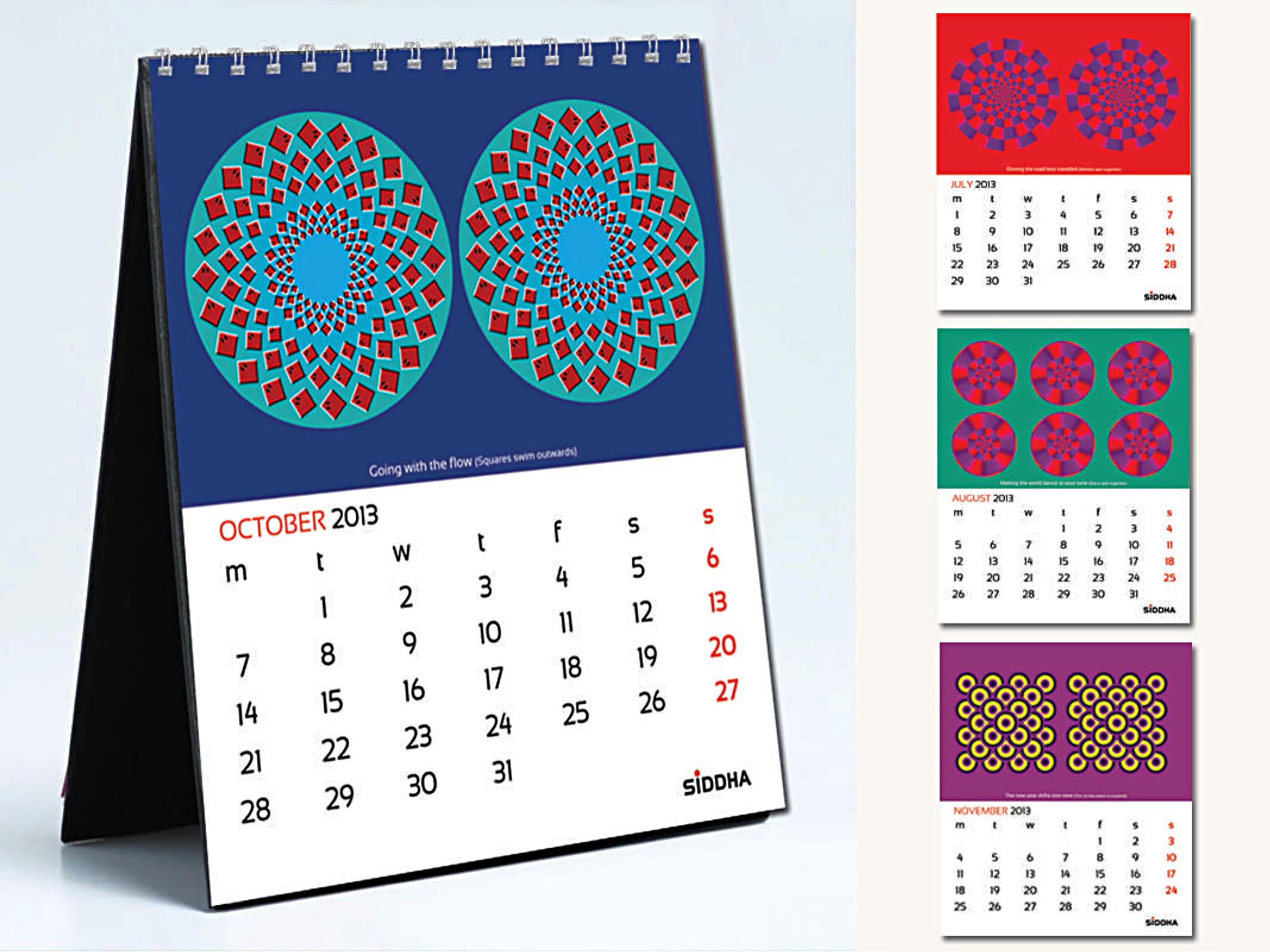 Siddha is a leading real estate company operating primarily in Eastern India. The 2013 calendar for it has the theme “Recreating the changing times”, inspired by the company’s baseline, Recreating Reality. The pages contain interesting optical illusions with relevant captions.