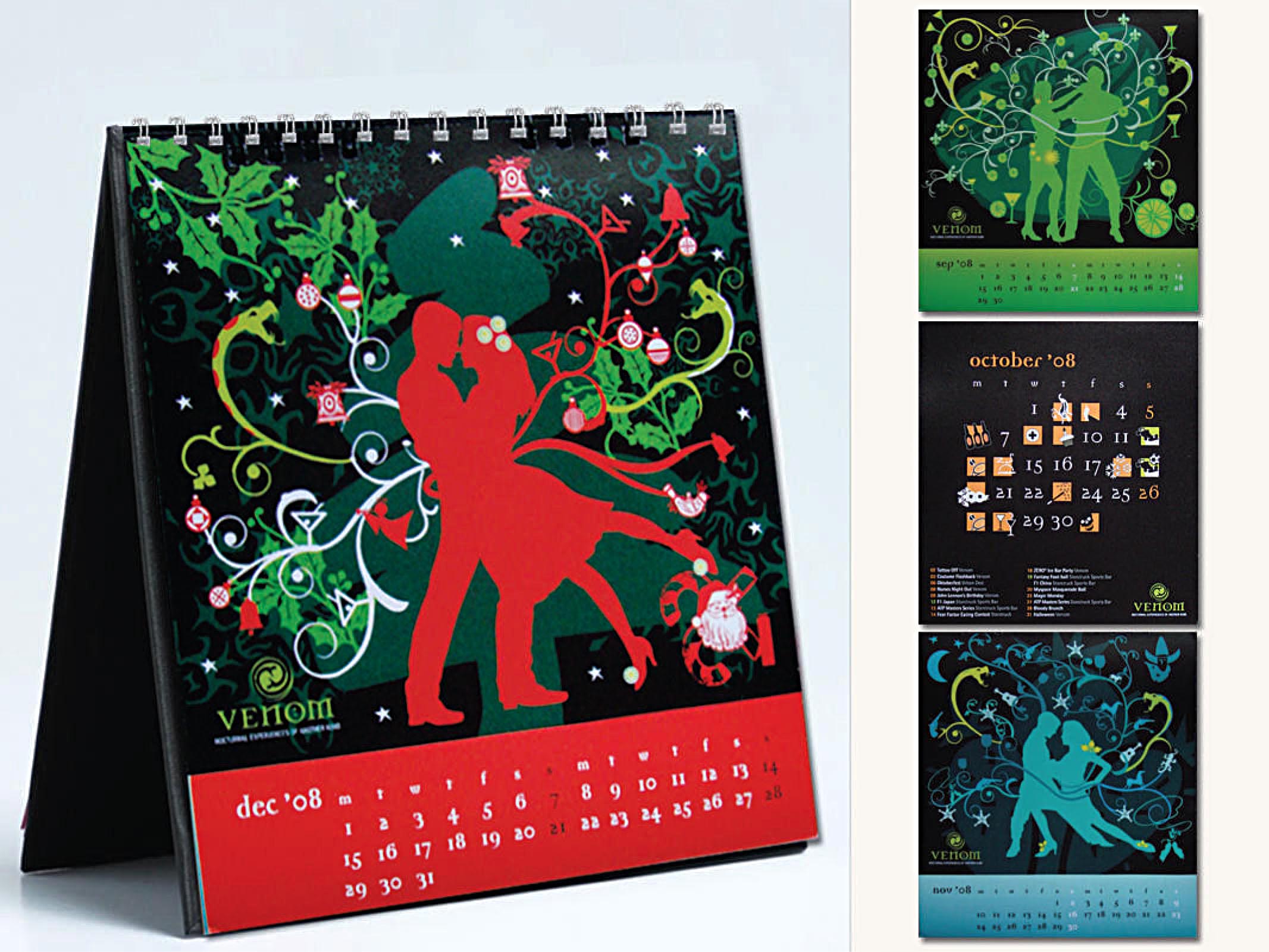Venom is a nightclub in Kolkata. The 2008 calendar for it has been made with a fluorescent colour scheme and a motif of nocturnal elements that elaborate its image and underscore it as an exciting experience.