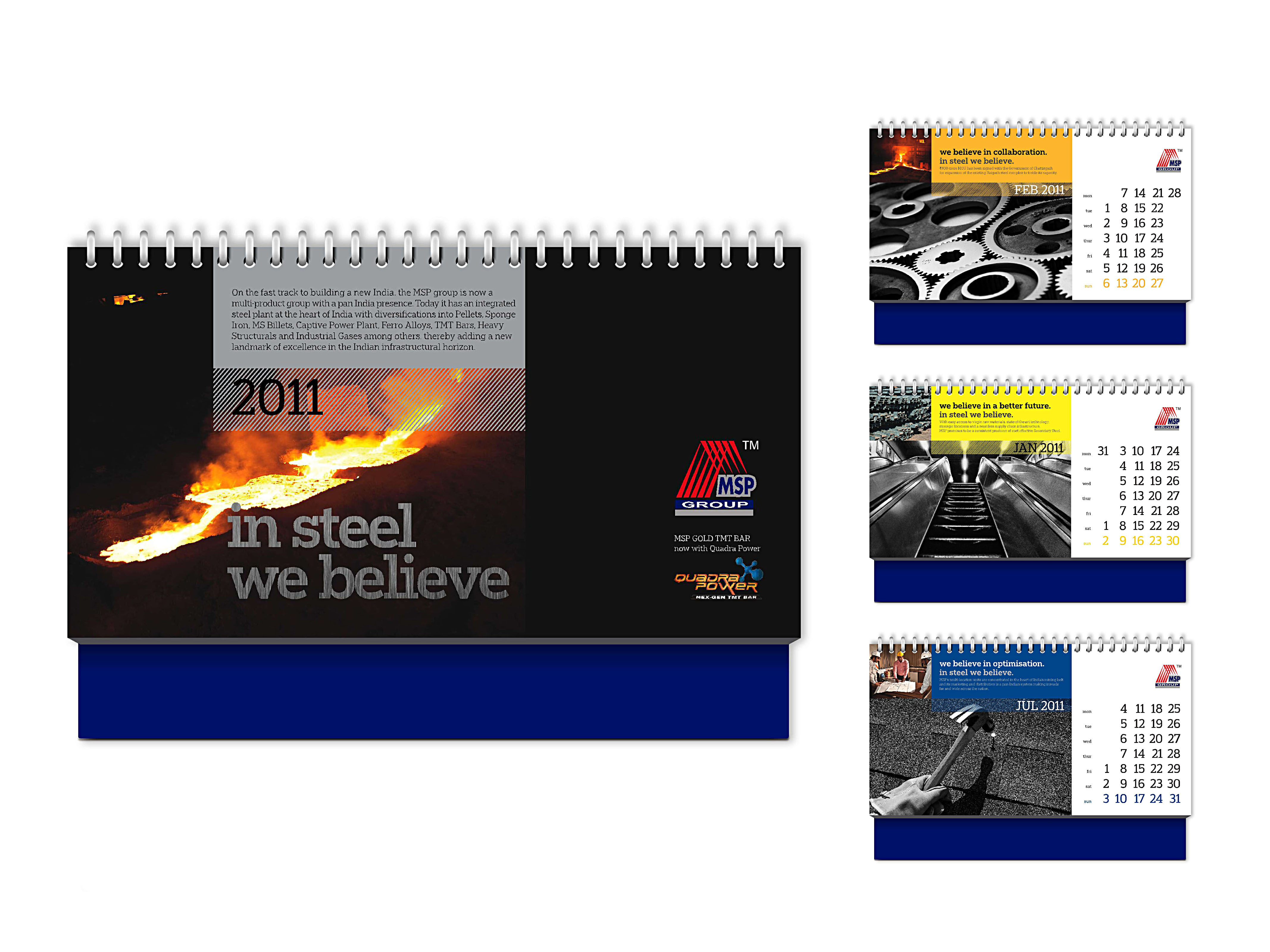 The MSP Group is an organisation that specialises in power and steel manufacturing. Their 2011 calendar was designed to reaffirm the Group’s commitment to quality steel and steel products. Using dramatic black and white photography counterpointed by the Group colours.