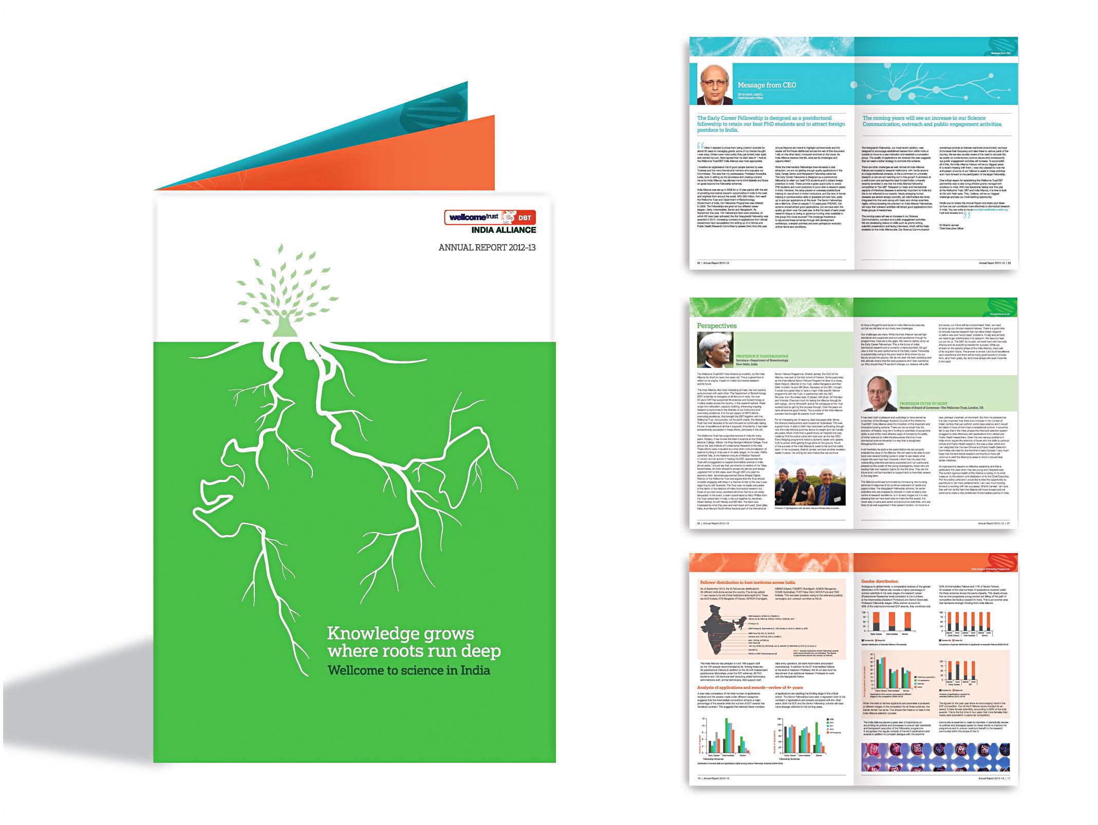 The 2012–2013 annual report for the Wellcome Trust/DBT India Alliance wanted to emphasise the fact that the India Alliance helps Indian scientists abroad return home to continue their research in world class conditions. To this end we created the concept of returning to one’s roots. The cover line and image reflect this theme as do the colours used in the pages and section dividers inside. Seek More