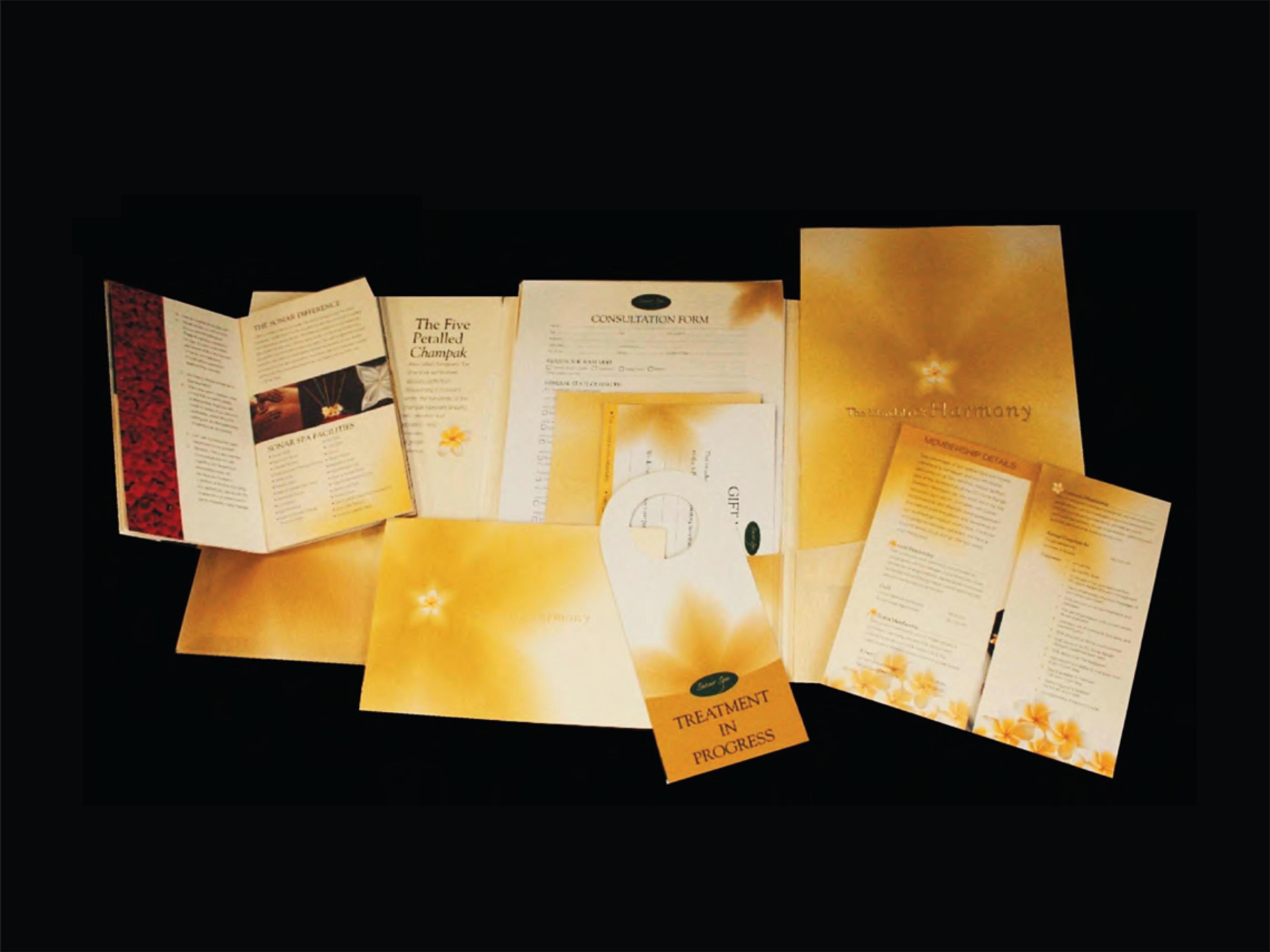 The brochure for the ITC Sonar Spa uses various techniques to impart a sense of relaxation, elegance and luxury. These include paying close attention to the paper and texture. The design uses the frangipani flower as its central theme. The backgrounds have been rendered as the flower creating patterns, like an abstract painting that recurs throughout the brochure.