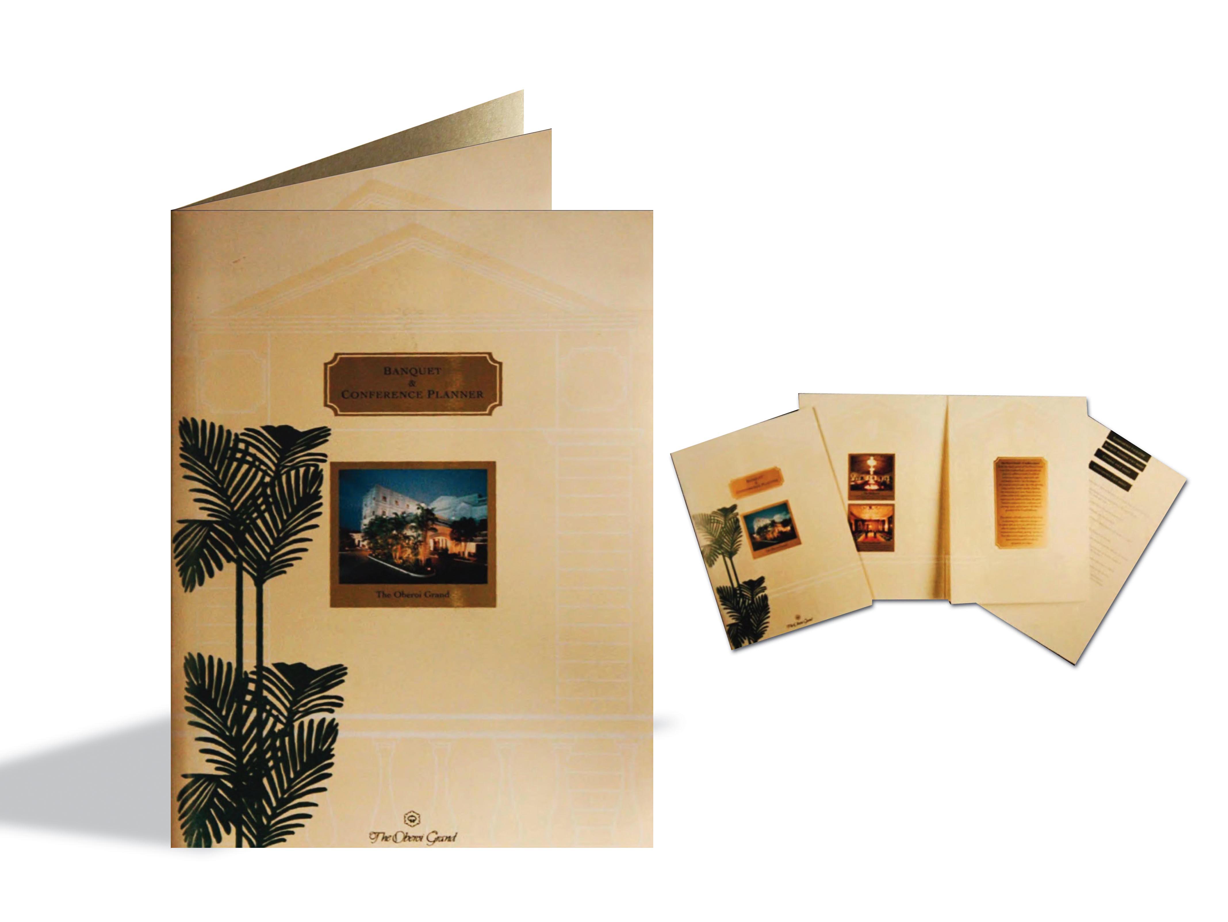 The Oberoi Grand, referred to as the Grande Dame of Chowringhee, is one of Kolkata’s premier hotels and has been for 125 years. The Hotel's Banquet & Conference Planner is rendered in an elegant gold style against a light background with white line illustrations. Pictures of the hotel and menus complete the planner.