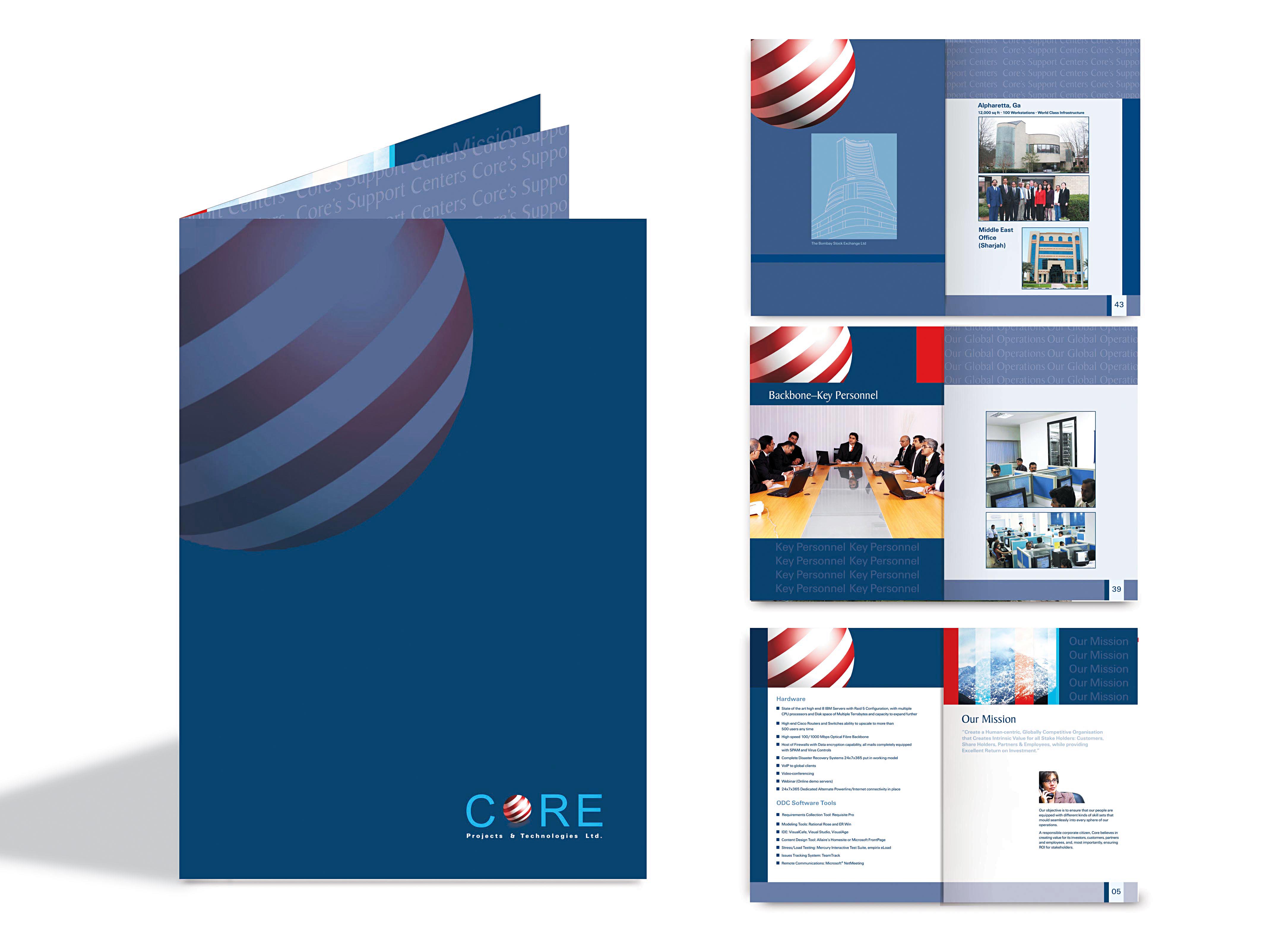 Core Projects & Technologies Ltd. is one of India’s fastest growing IT companies with a global outreach that reaches both developed and emerging markets. The idea for this brochure was born from this worldwide presence and it uses the circular logo element to denote the world of IT in motion. Blue has been used predominantly in alignment with the logo colour along with red to provide emphasis and contrast.
