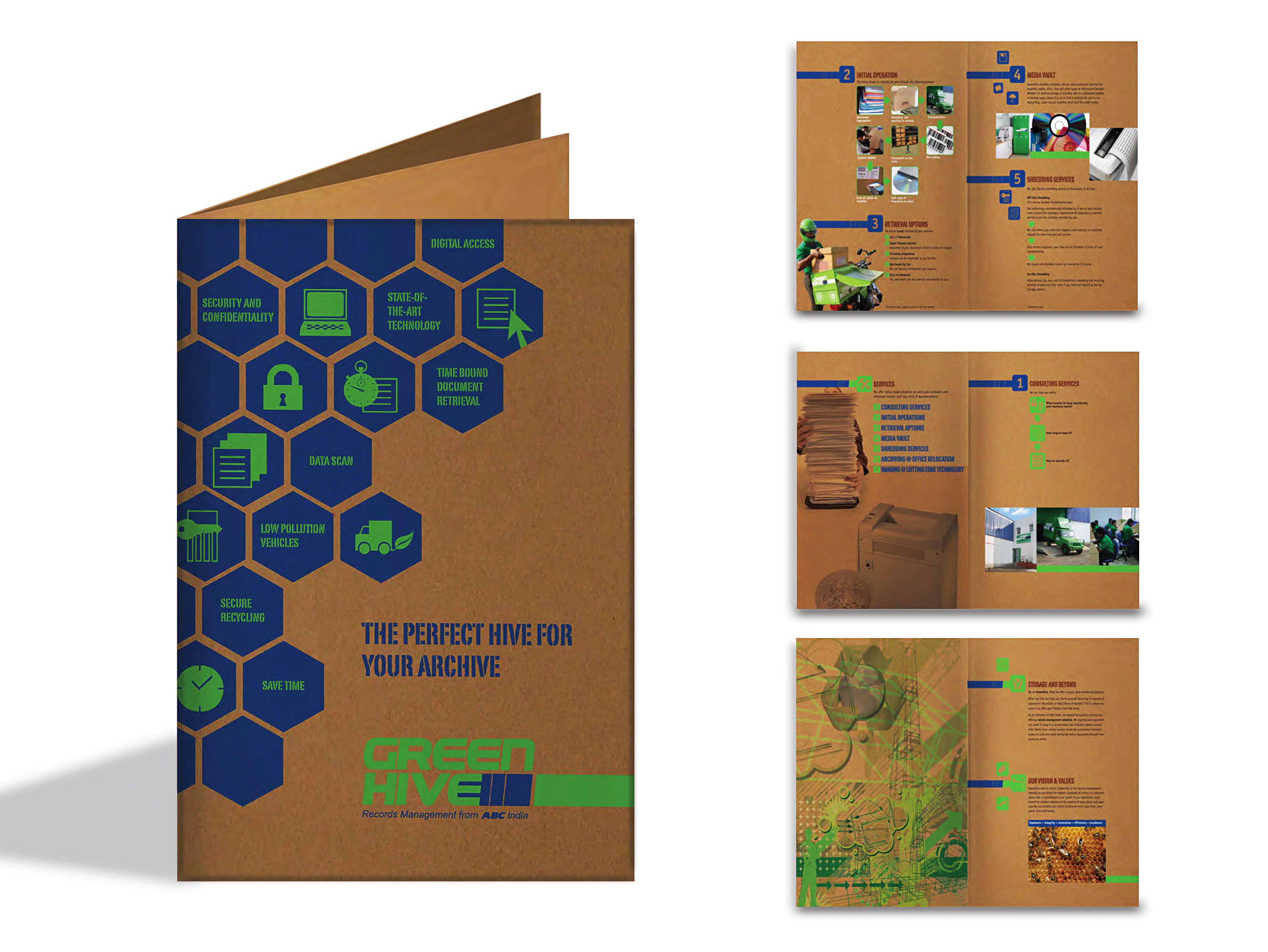 Green Hive is a division of ABC India Limited, a company with 45 years of logistics experience. It is an initiative to expand services in the logistics industry by offering record management solutions. While the logo connotes speed and motion, the brochure is designed using a beehive as a visual metaphor for storage and warehousing. The craft paper base using recycled paper, signifies that Green Hive is an eco-conscious company.