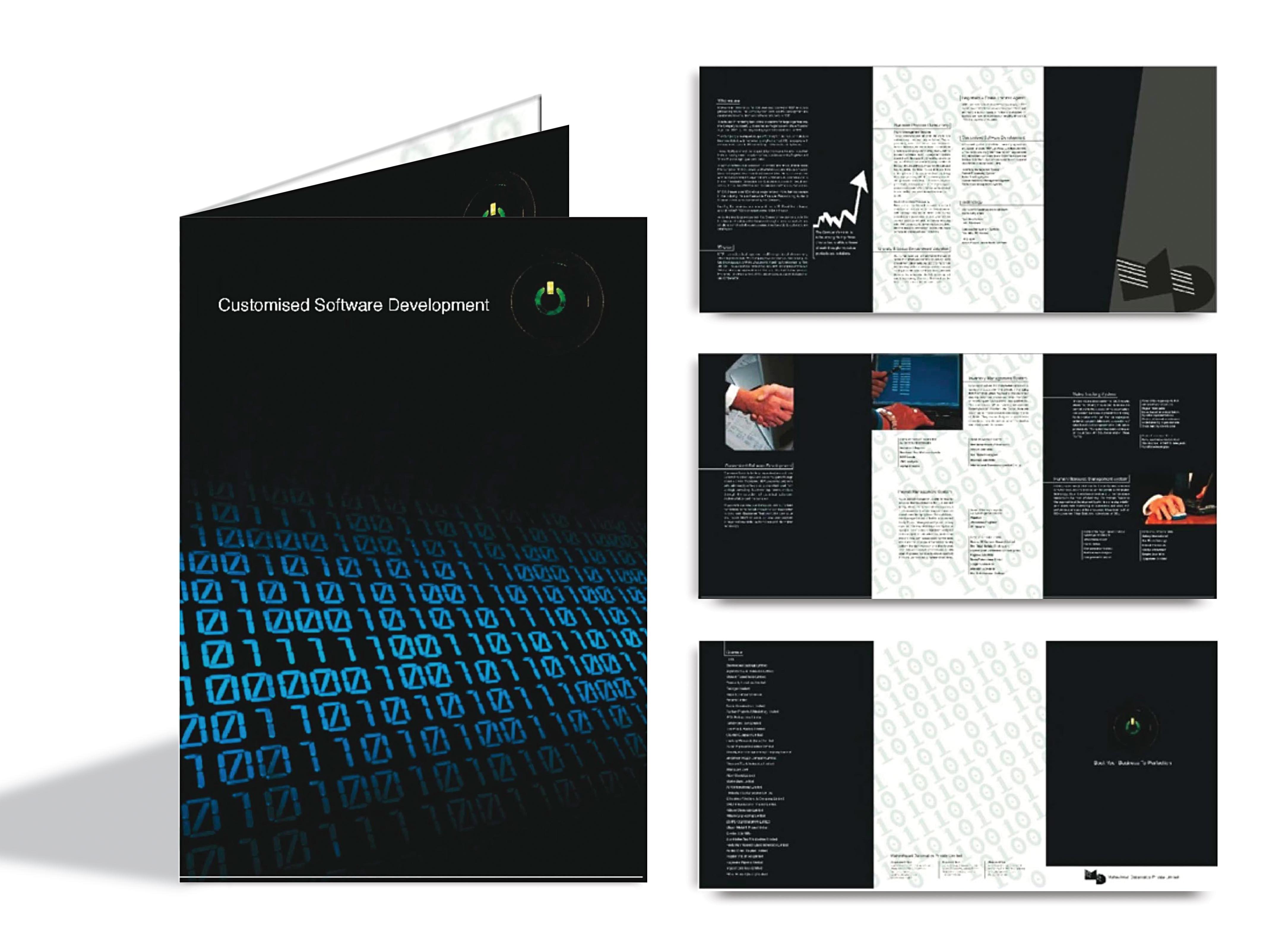Maheshwari Datamatics Private Limited is one of the largest data processing houses in Eastern India and a leading IT company offering customised software solutions. The brochure features a computer power button on its cover. The remainder of the brochure incorporates backgrounds with 1s and 0s that are borrowed from computer binary language to represent a specialisation in software solutions.