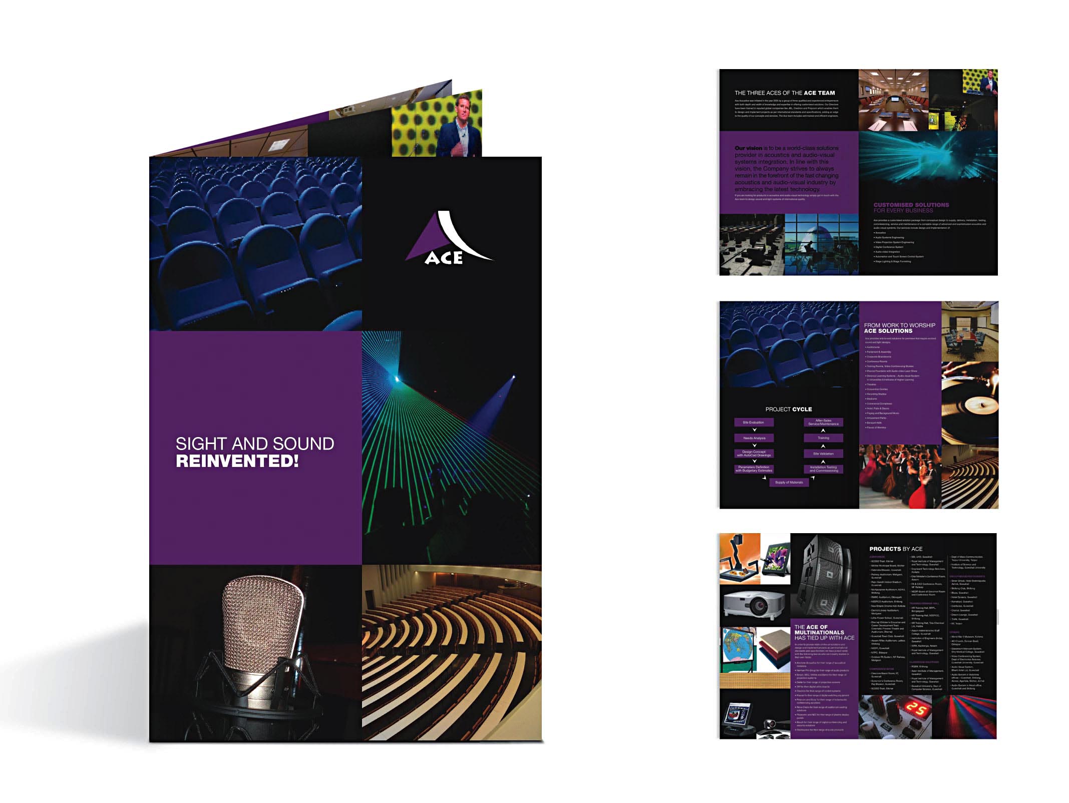 ACE is an acoustics management company based in Kolkata. The corporate profile we created for it used a purple and black colour scheme with images of events and acoustic equipment displayed at appropriate intervals throughout.