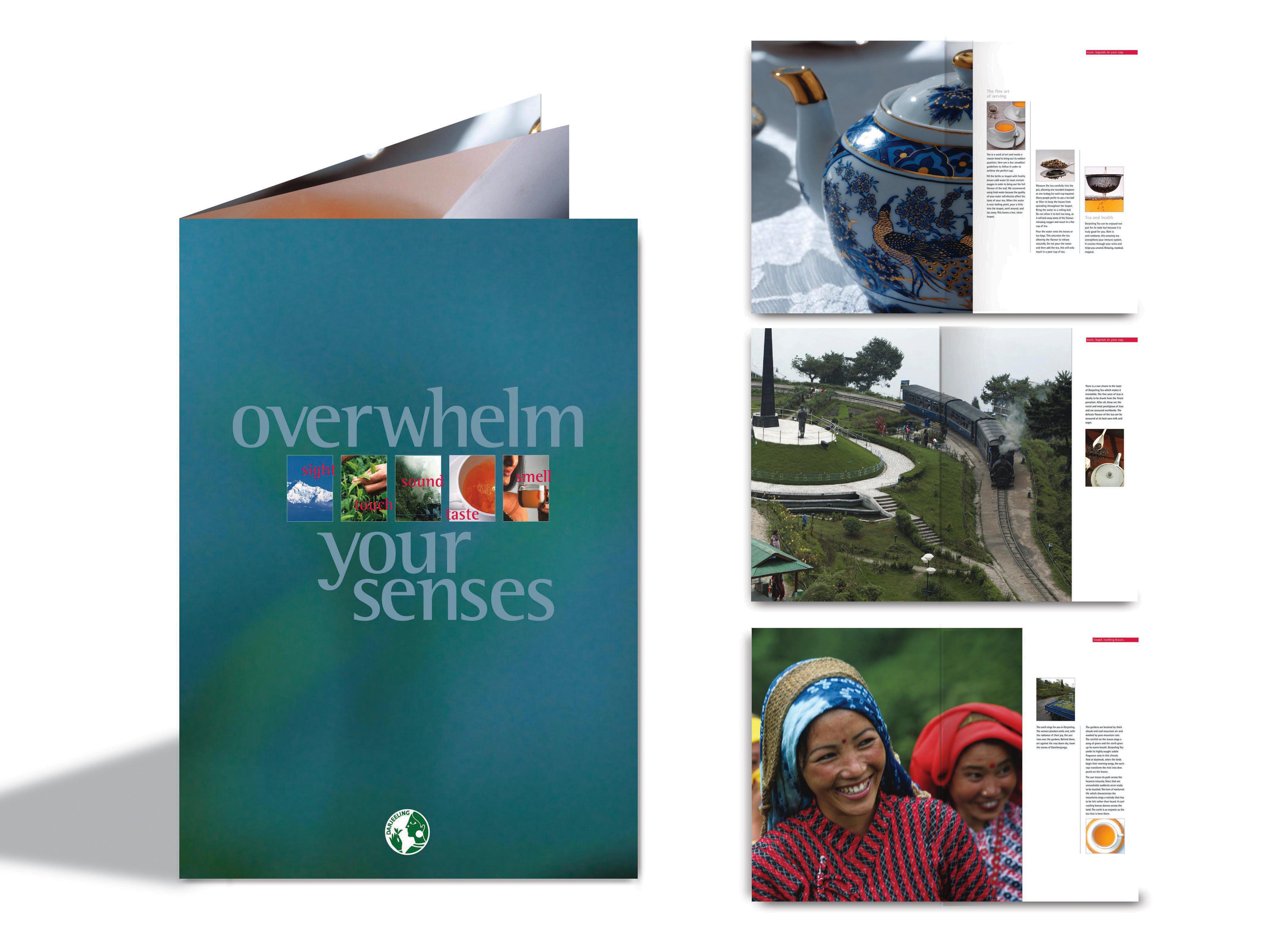 All tea produced in the tea growing areas of India, including Darjeeling, are administered by the Tea Board of India. Darjeeling Tea Association assists the Tea Board in authentication, protection and preservation of Darjeeling Tea. The brochure uses the idea of the five senses relating them to different stages in the processing of tea. The concept touches upon the production, processing and consumption of tea as a sensorial experience.
