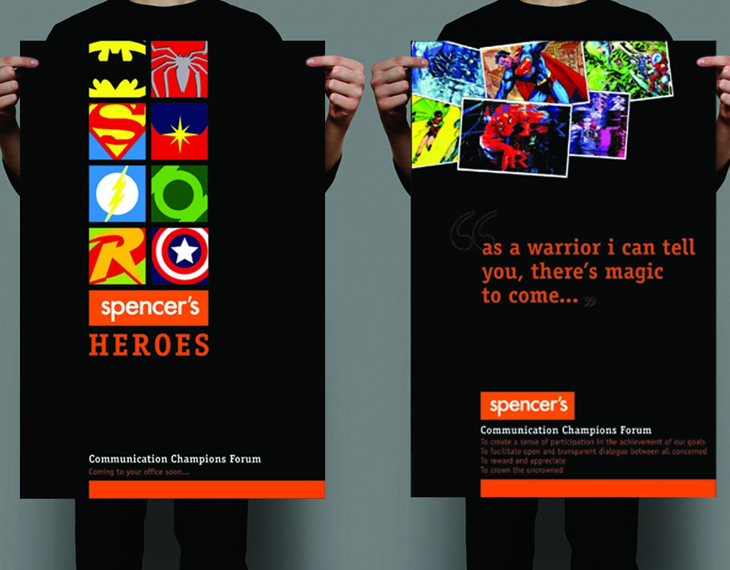 A initiative for internal communication. The forum was named Communication Champions Forum, in keeping with that trend, the visuals were taken from superhero emblems and set against stark black to highlight the colours with the Spencer's orange as accent. Seek More