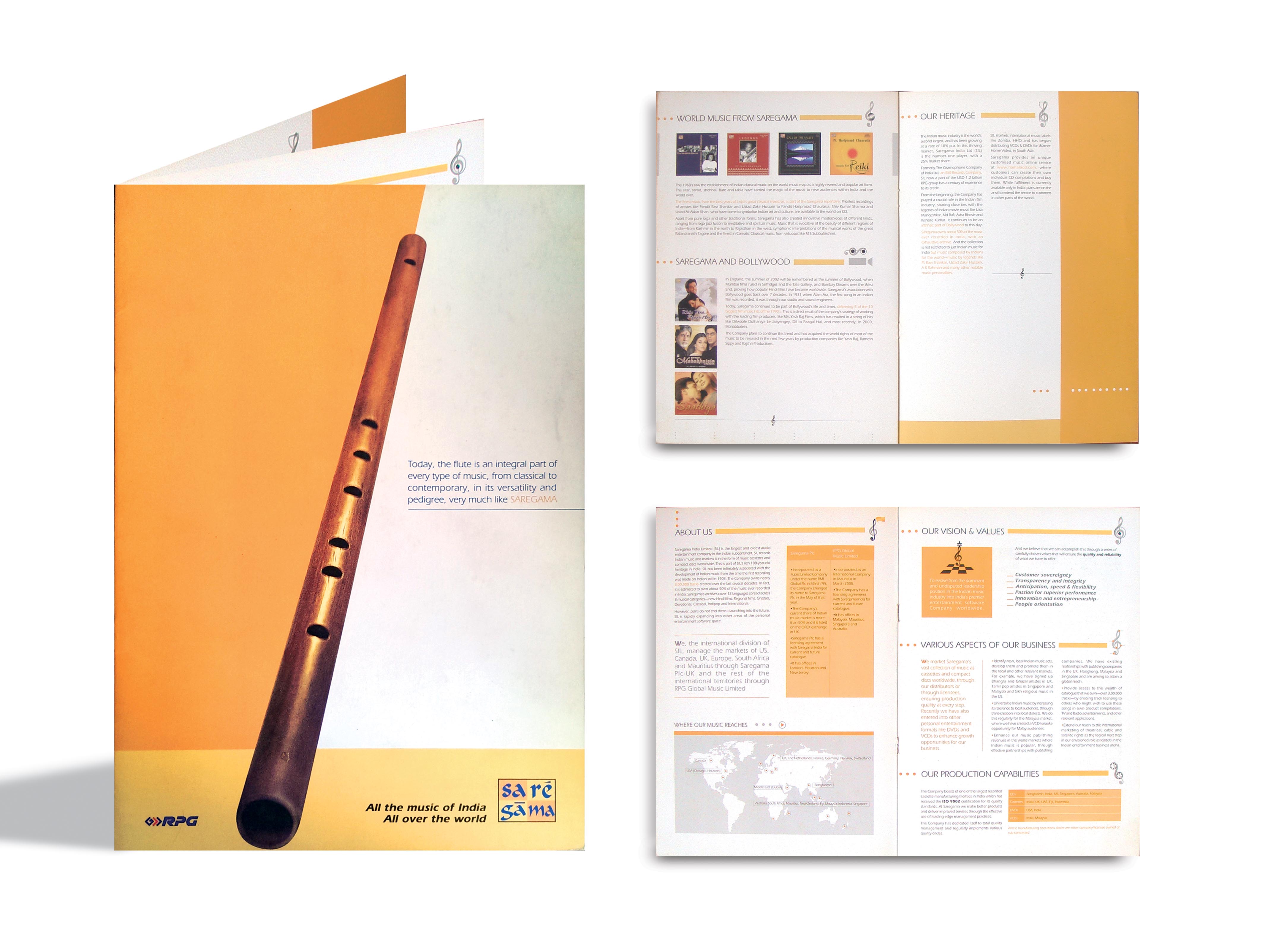 Used the image of a flute to flag Indian music. Different notations were used on the pages as graphic elements and the colours were kept to a muted orange and white taken from the Sa re ga ma logo family.