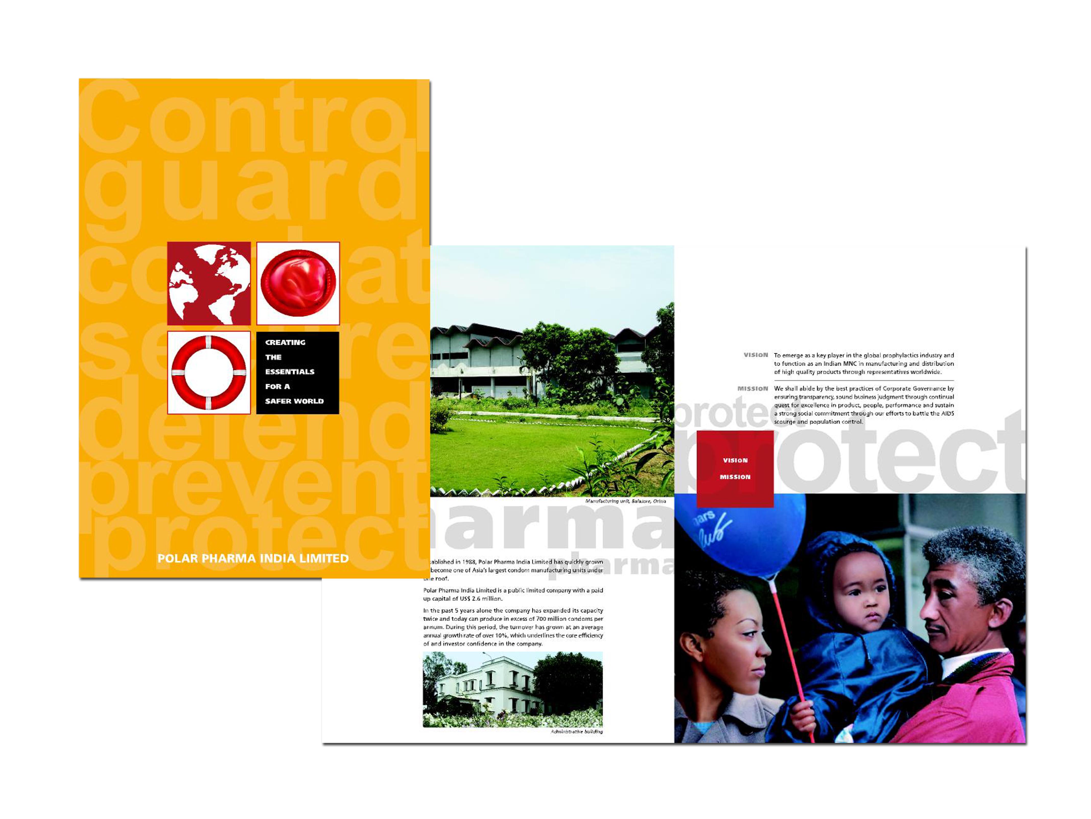 An export brochure created for Polar Pharma's latex factory and its condom range. The focus was on safety for a better world. Words relating to safety and protection were used as part of the design both on the cover and inside.