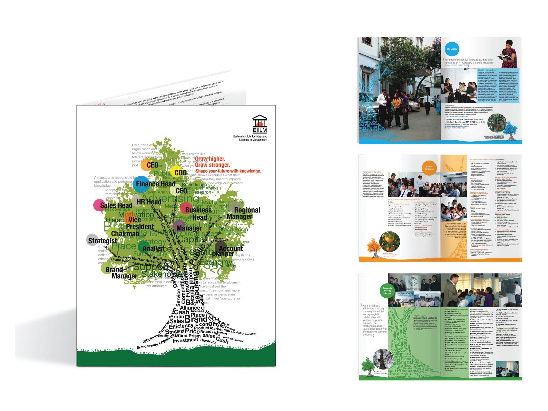 The Eastern Institute for Integrated Learning in Management (EIILM) is a highly focused specialised centre for professional education aimed at building careers in management. The concept for the cover of this brochure was the tree of knowledge and its divergent branches of specialisation. This design concept has been continued inside. Seek more