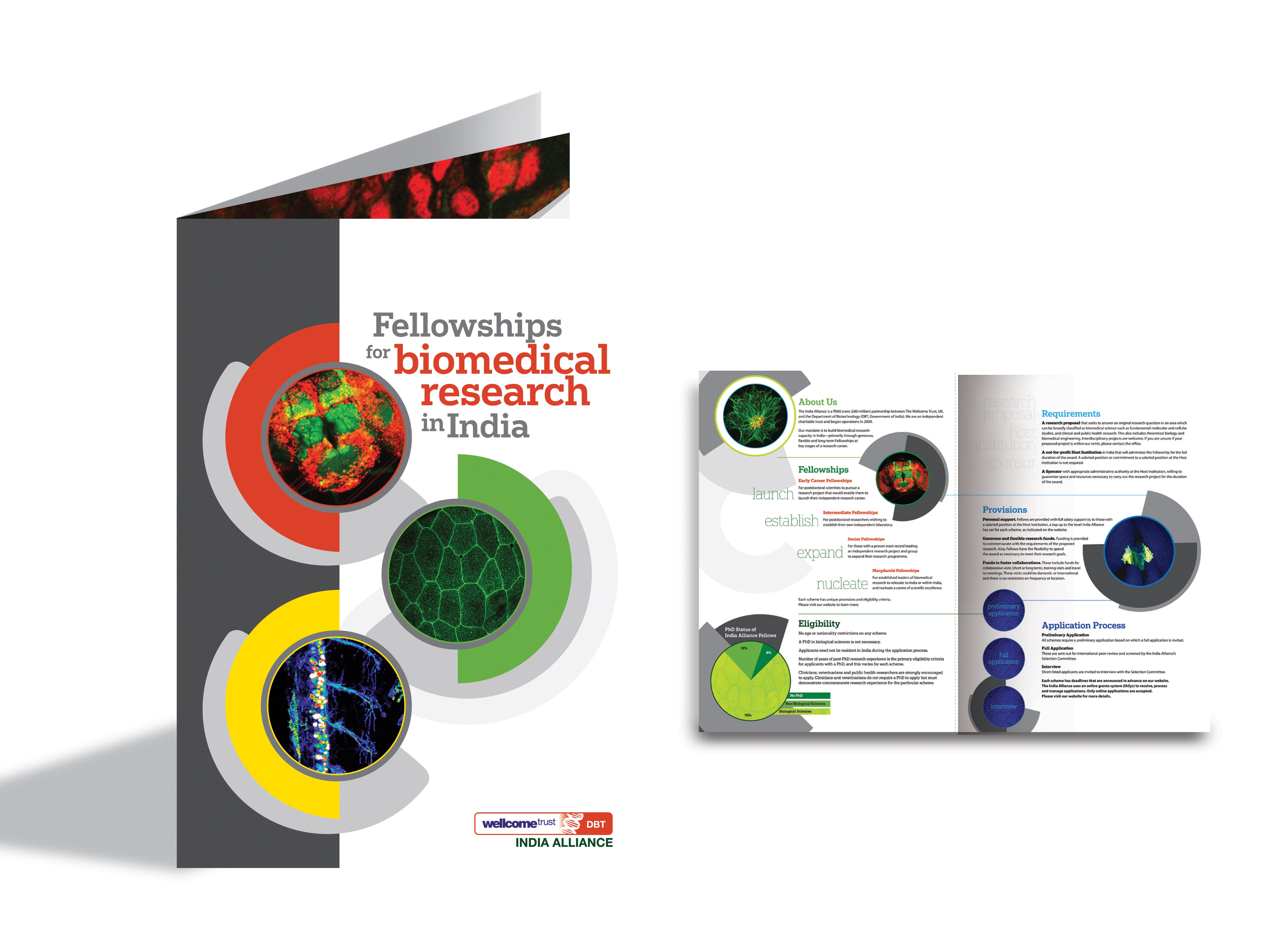This Wellcome Trust/DBT India Alliance leaflet was created for distribution at science seminars and expos to scientists who may consider applying for an India Alliance fellowship. It uses neat, bright inforgraphics against a predominantly white background to attract attention and expound the India Alliance fellowship categories effectively. Seek more