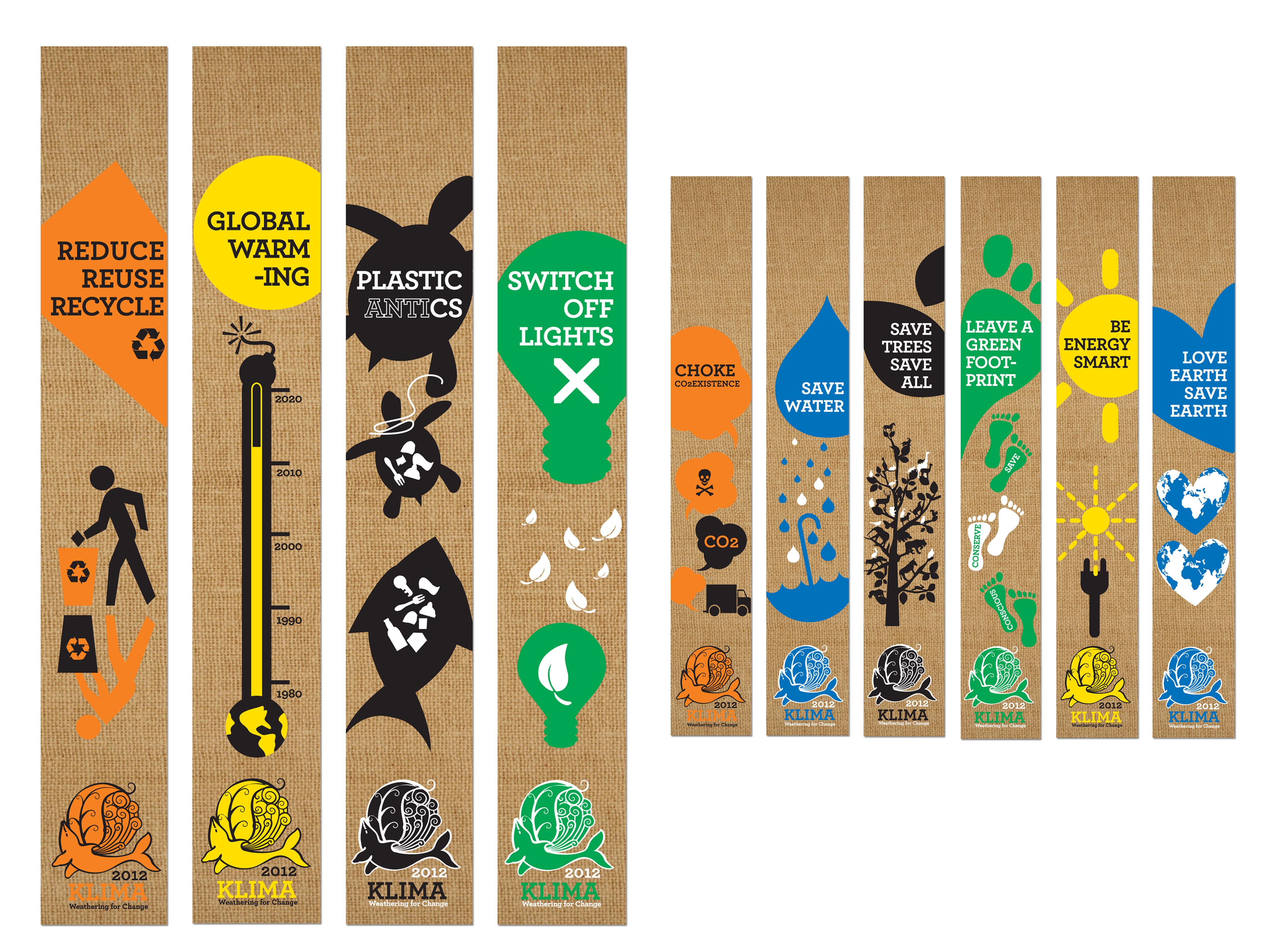 Klima is the environmental club at Loreto House, one of Kolkata’s most prestigious schools. These panels were created for it and printed on recycled jute. They depend heavily on iconography to convey the essential message of ‘Reduce, Reuse, Recycle’. Each panel is devoted to particular facet within this broader theme, such as switching off lights, using less plastic products, save water etc. Seek More