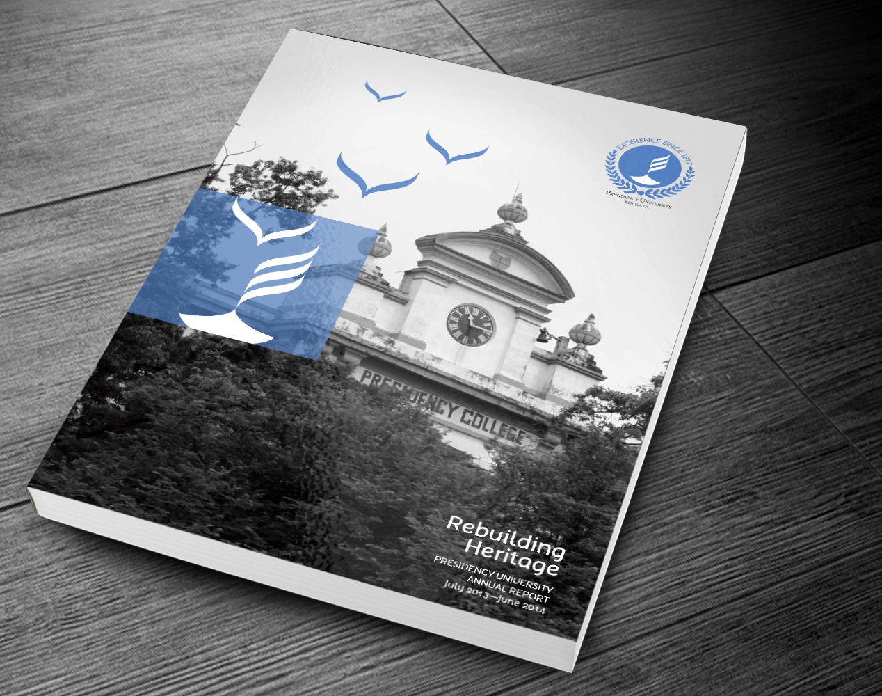The Annual Report for Presidency University displays the facade of the historic building to highlight the heritage theme and uses a form from the logo to represent birds in flight, thus highlighting the soaring future of the new University. Seek More