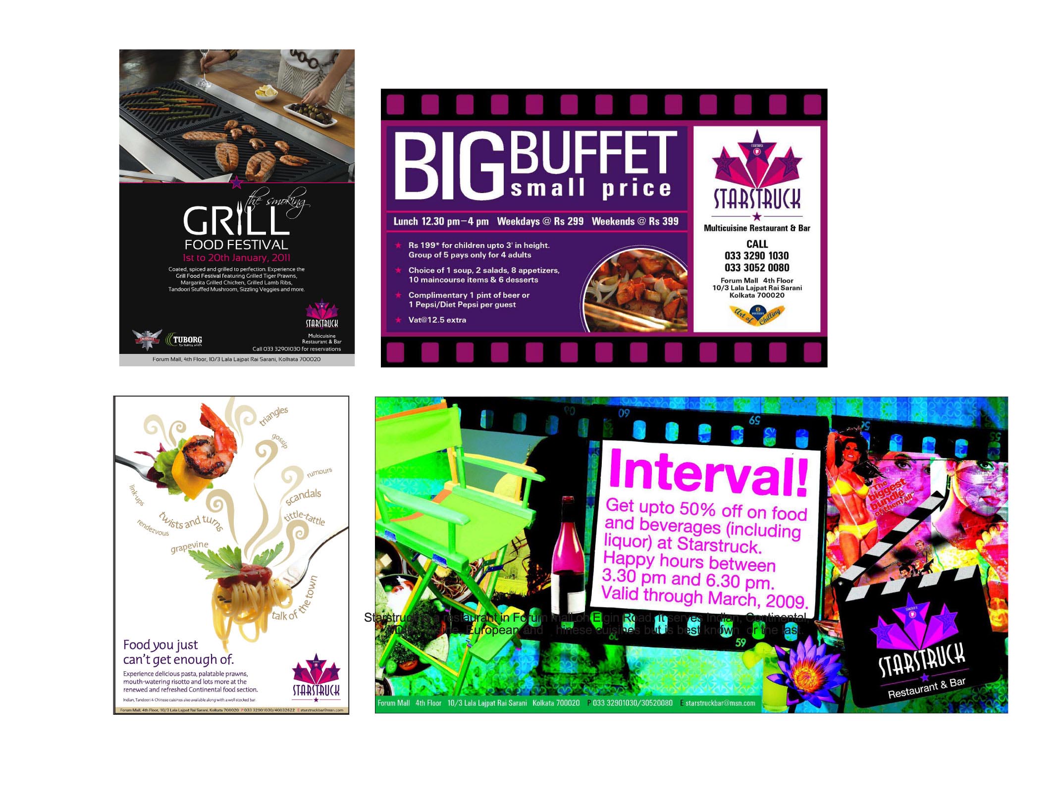 Starstruck is a restobar in Forum Mall on Elgin Road serving excellent cocktails and eclectic world cuisine. We created its identity and restaurant collaterals including menu cards, posters, discount vouchers and invitation cards. Seek more