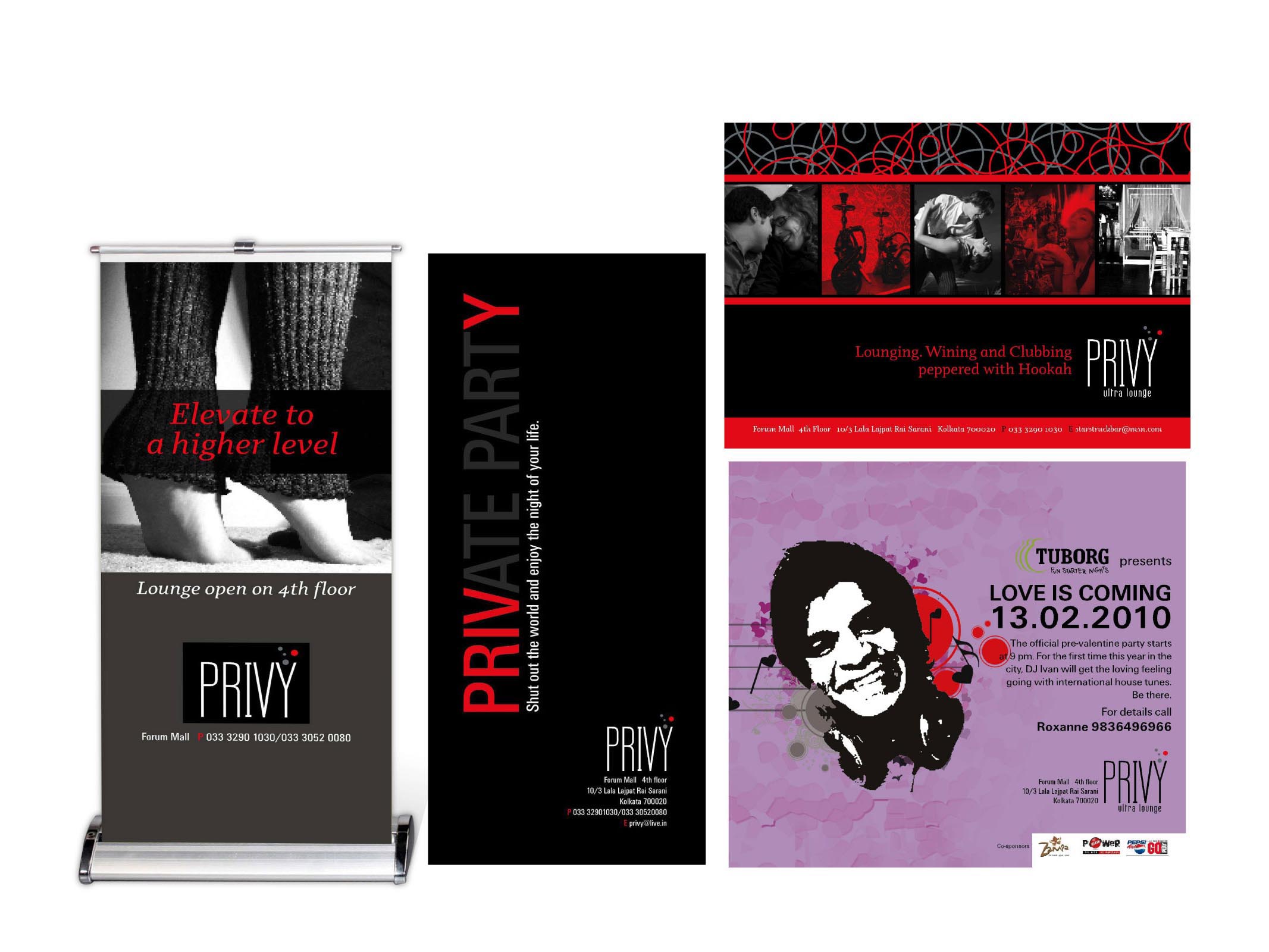 These standees and invitation cards were created for Privy and throughout them a marked use of black accentuates the brand’s overarching mood, dark and exciting. Purple and red have been used as contrasting colours, the red deriving from the brand’s logo itself. In one card, the words Private Party have been treated typographically to make the letters PRIVY stand out in red. Seek more