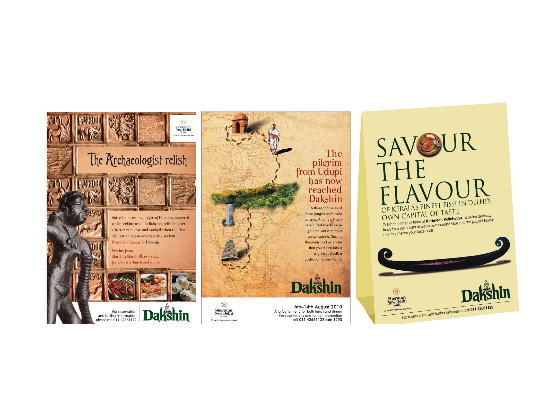 Sheraton New Delhi is a five-star hotel located conveniently in the business district of South Delhi. These two posters and a tent card were created for Sheraton's Dakshin restaurant for its Dravidian, Udupi and Kerala food festivals respectively. Seek more