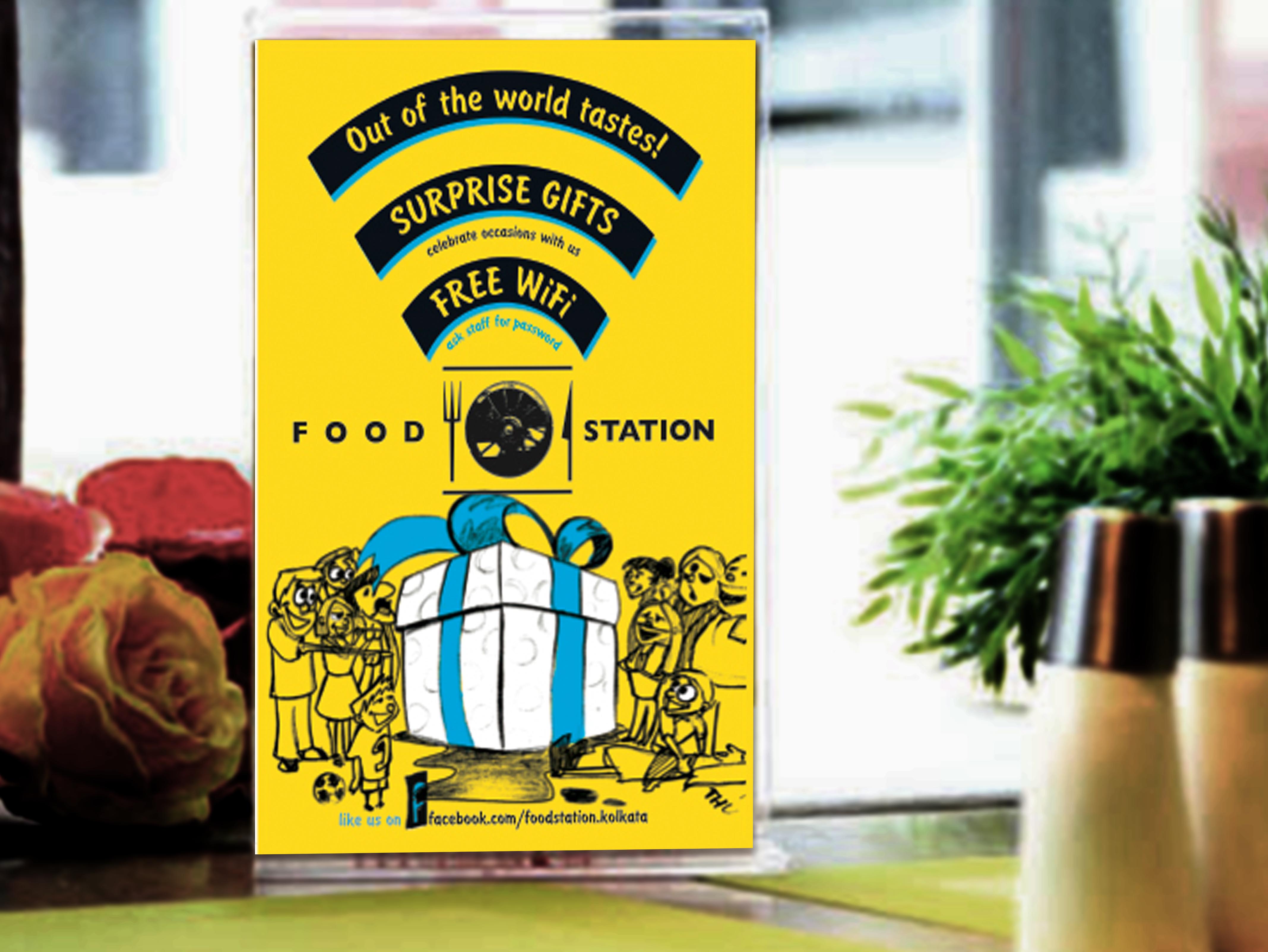 A popular hangout place for college students which offers great food at reasonable rates. This Tent Card was designed announcing free WiFi for the customers and free gifts