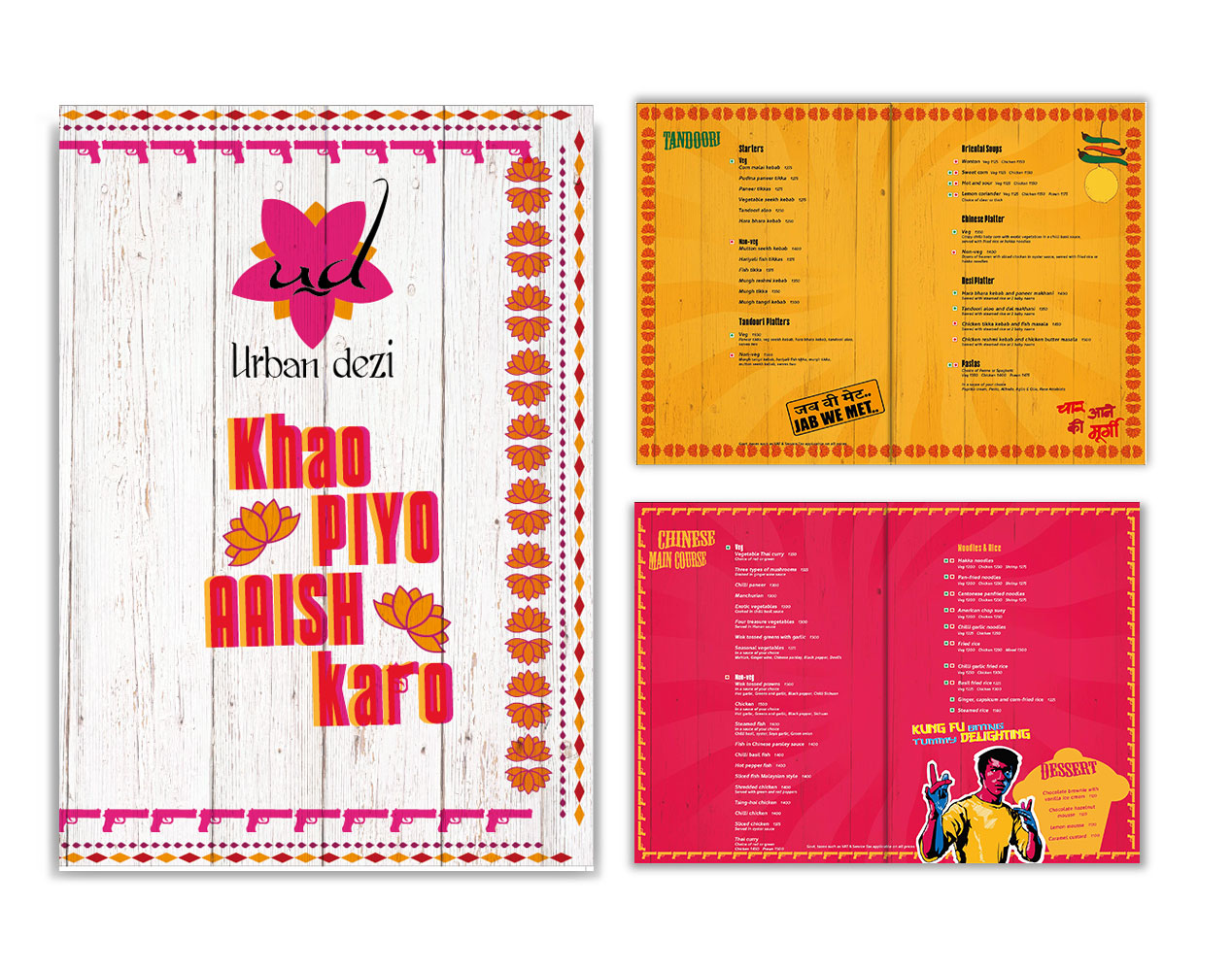 This food menu for Urban Dezi uses the theme of Bollywood and filmy memes in the way of colours, pictures and quirky quotations Seek More