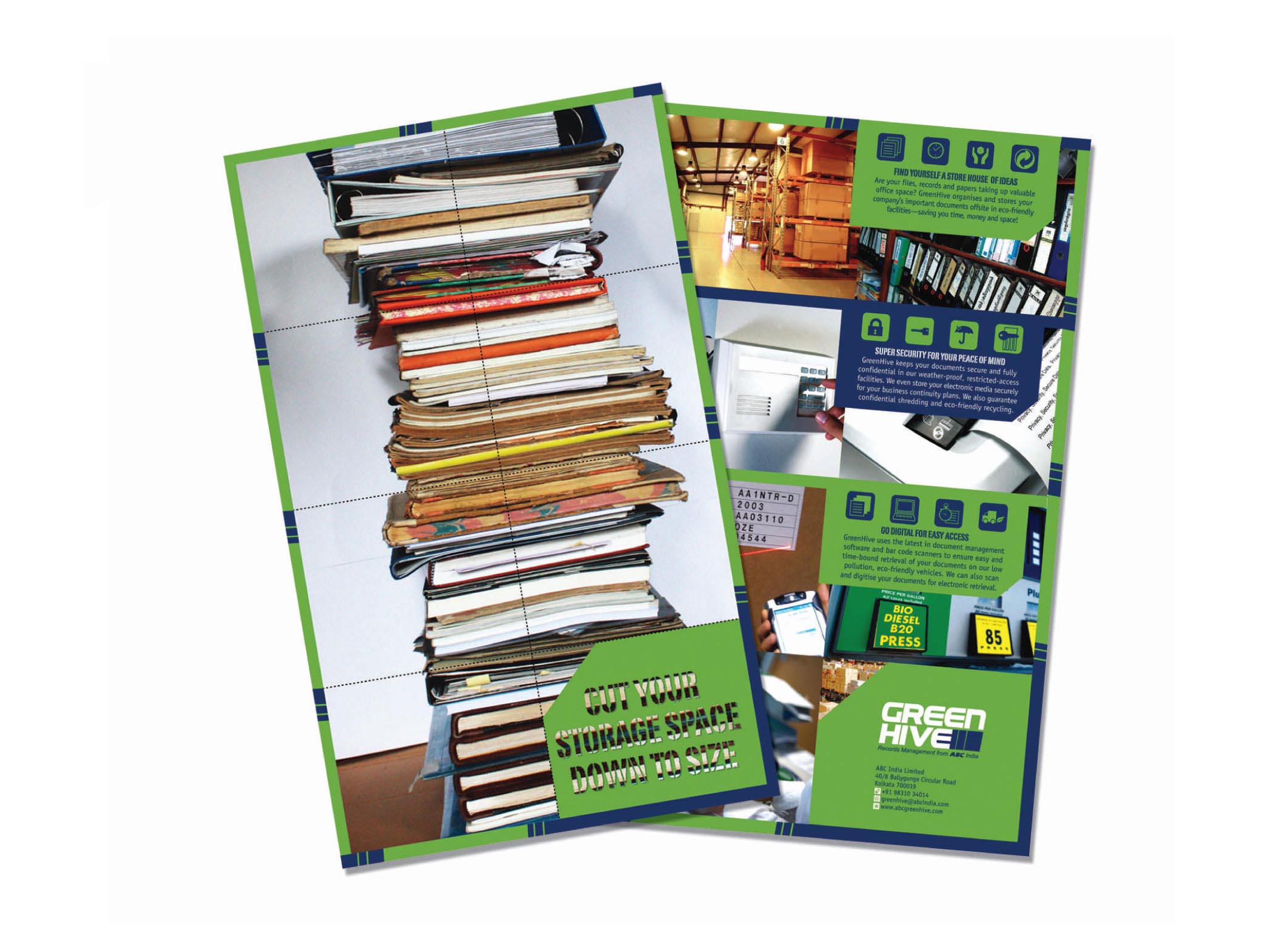 The foldable leaflet that was created for Green Hive uses a neat grid design with pictures of the Company’s various storage. Seek more