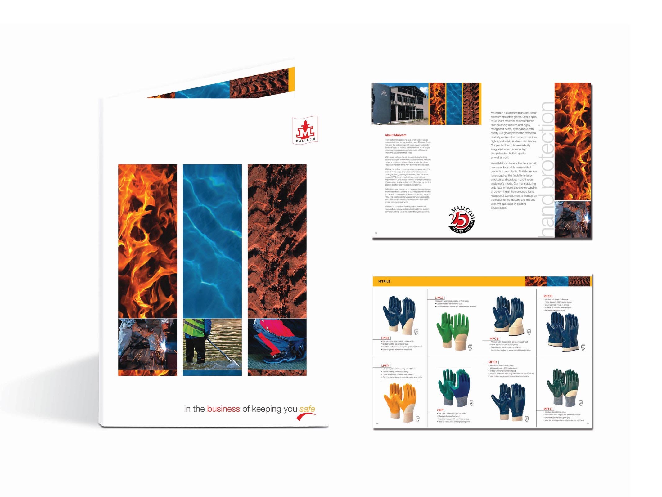 Mallcom is the country’s largest integrated manufacturer and distributor of Personal Protective Equipment. The brochure uses the three elements of fire, water and earth and uses them to represent hand, body and feet protection respectively. The pages of the catalogue use colour-coded sections and a neat, grid format to present the individual products. Seek More