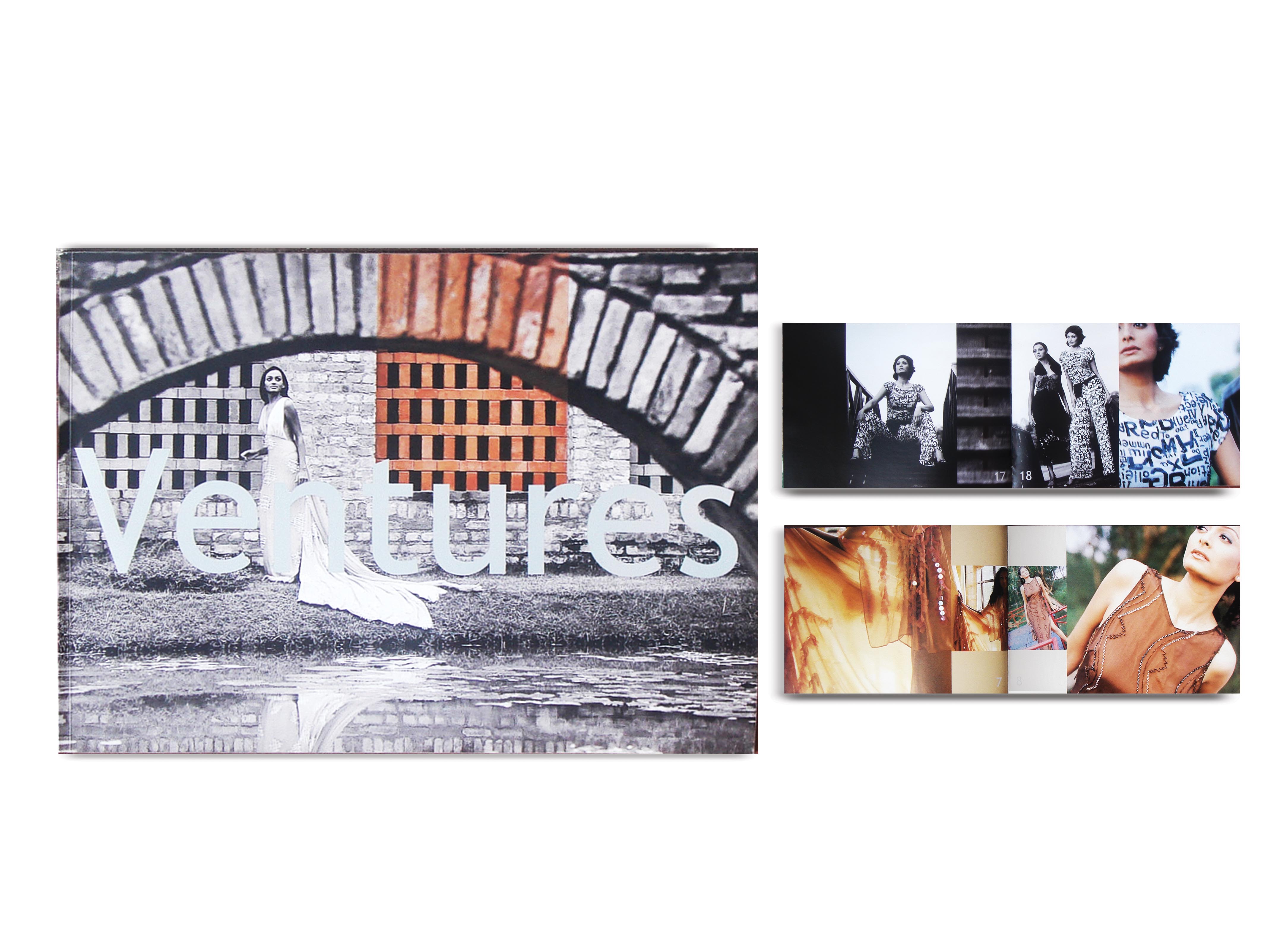 Ventures is a range of customised as well as ready-to-wear couture outfits, each piece exquisitely detailed and handicrafted. The brochure is divided by stylised section dividers and showcases the fabrics and designs as worn by models. The look of the entire catalogue is extremely minimalistic and uncluttered. Seek more