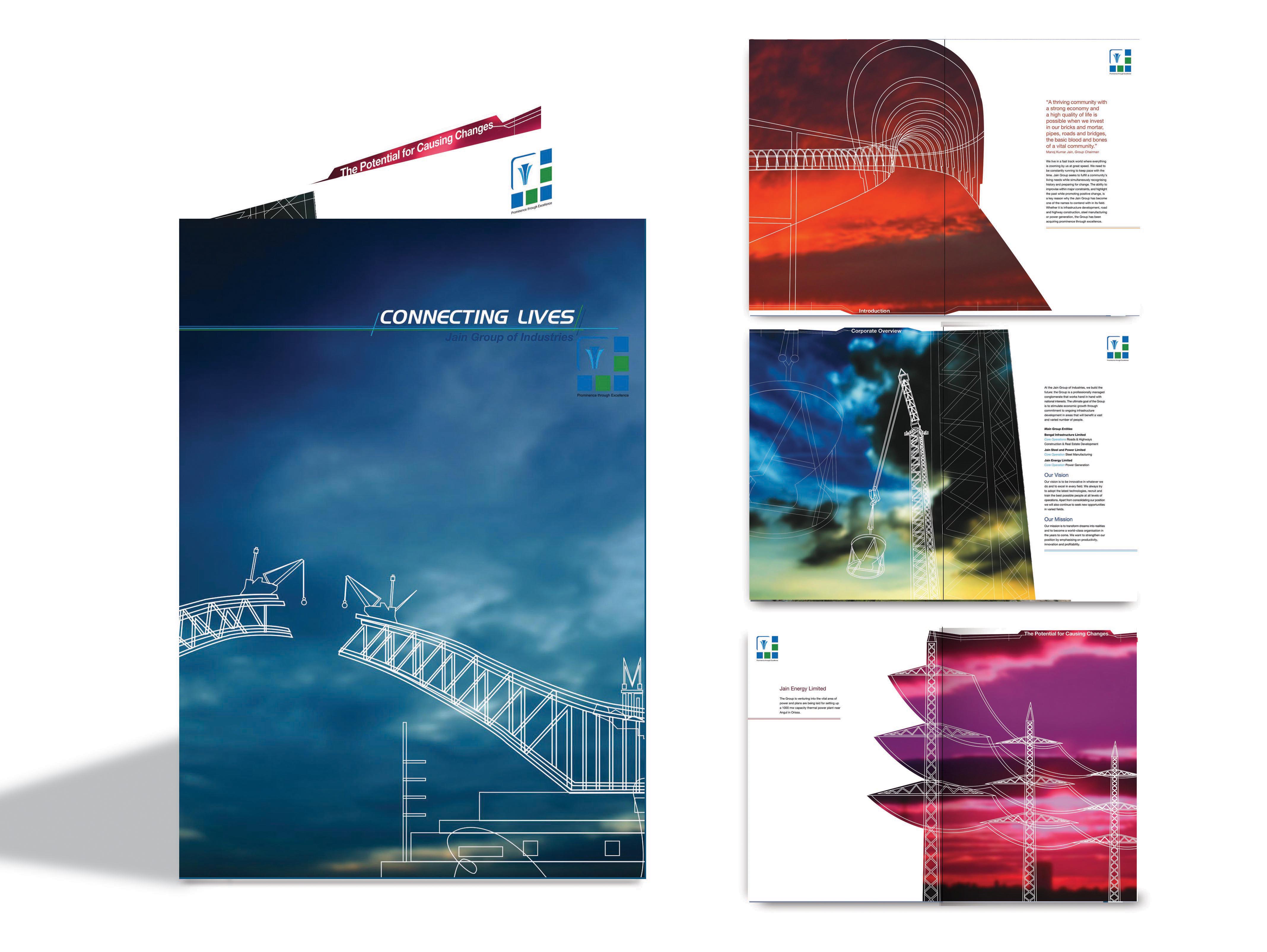 The Jain Group of Industries is involved in the areas of infrastructure development, steel manufacturing and power generation. At the time the brochure was created, they had recently begun operations and the manufacturing unit was being set up. The representative images are futuristic, line illustrations against abstract backgrounds. Each image depicts an act of construction that touches upon building relationships and connecting lives/people.