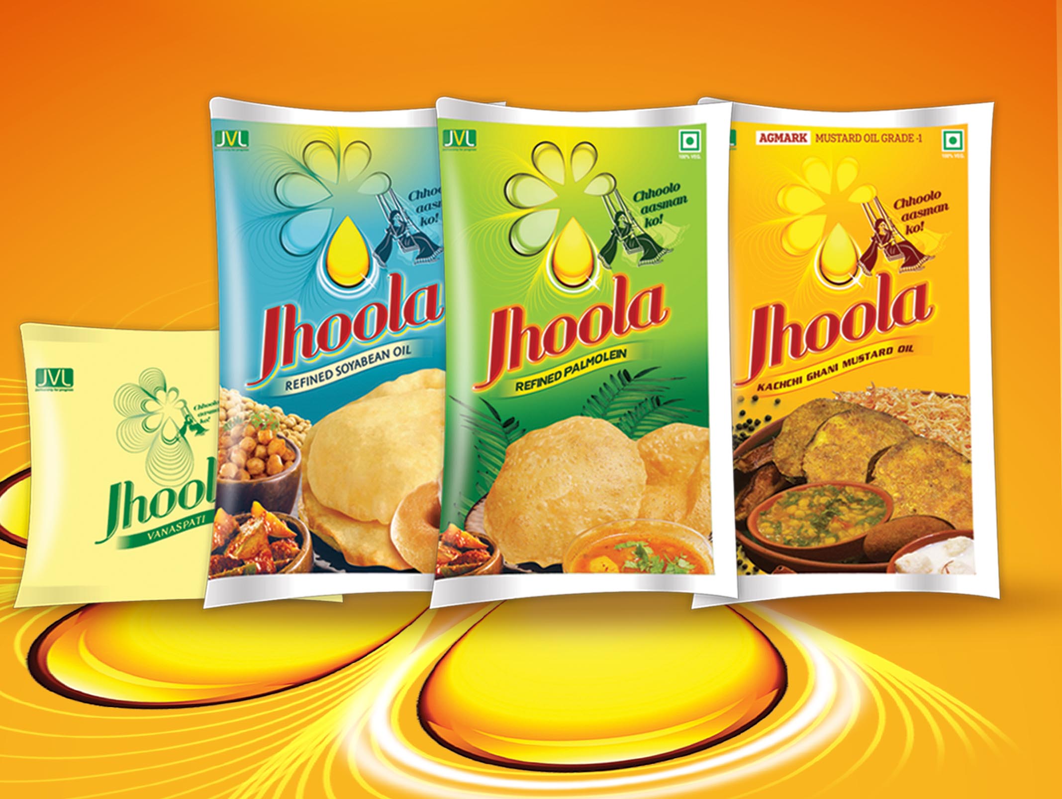 JVL's Jhoola range of mustard oil, refined palmolein oil, soyabean oil and vanaspati was derived from the essential premise of the brand—"Chhoolo aasman ko!" The design used a golden droplet that was used in creating a floral pattern that creates an immediate connection with health and quality. Seek more