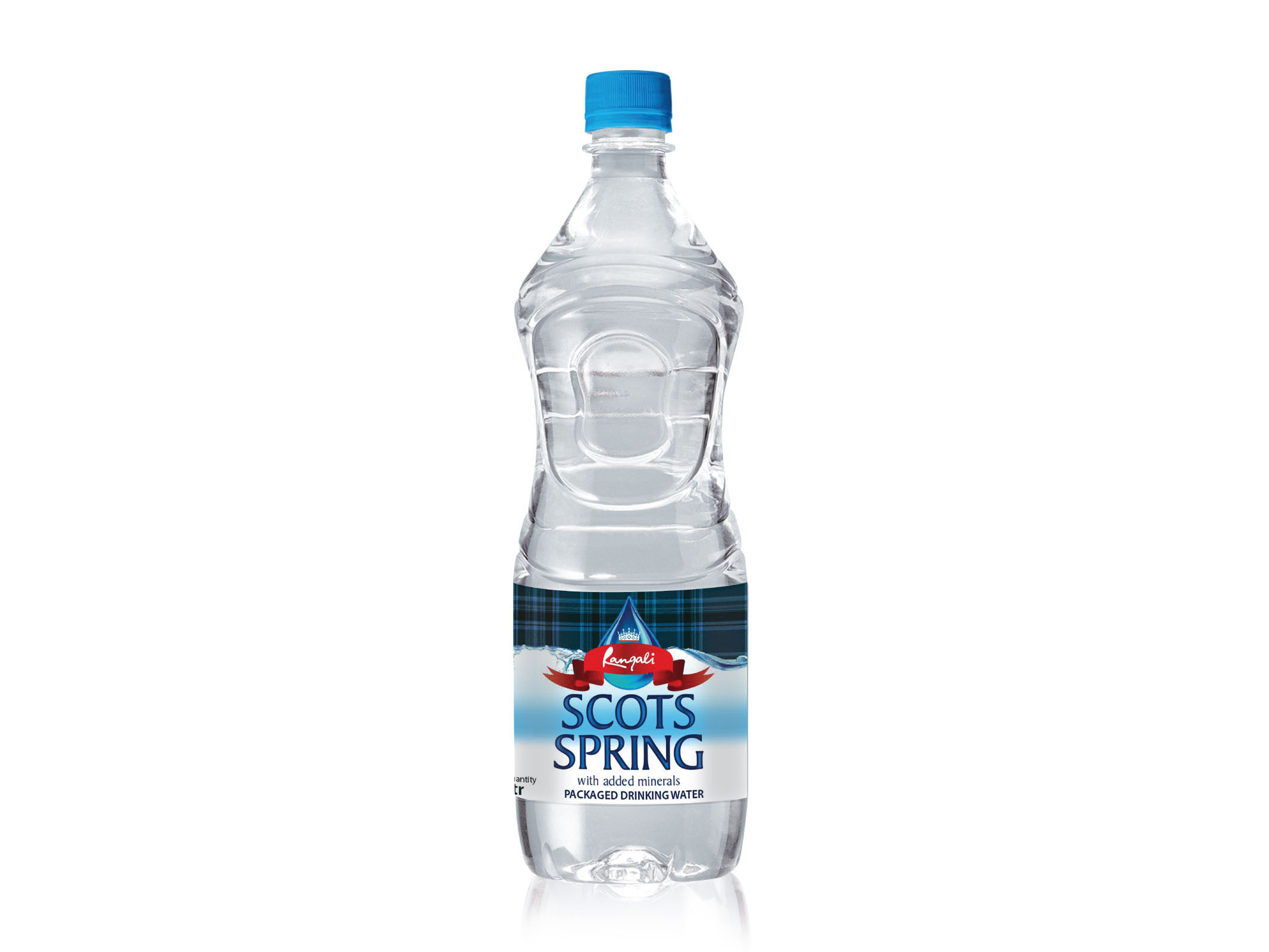 This bottle label design was created for Scots Spring, packaged drinking water brand from the house of Rangali. It features a tartan pattern that echoes strains of Scotland along with a commemorative red ribbon element and crest set against a large drop of water. Seek more