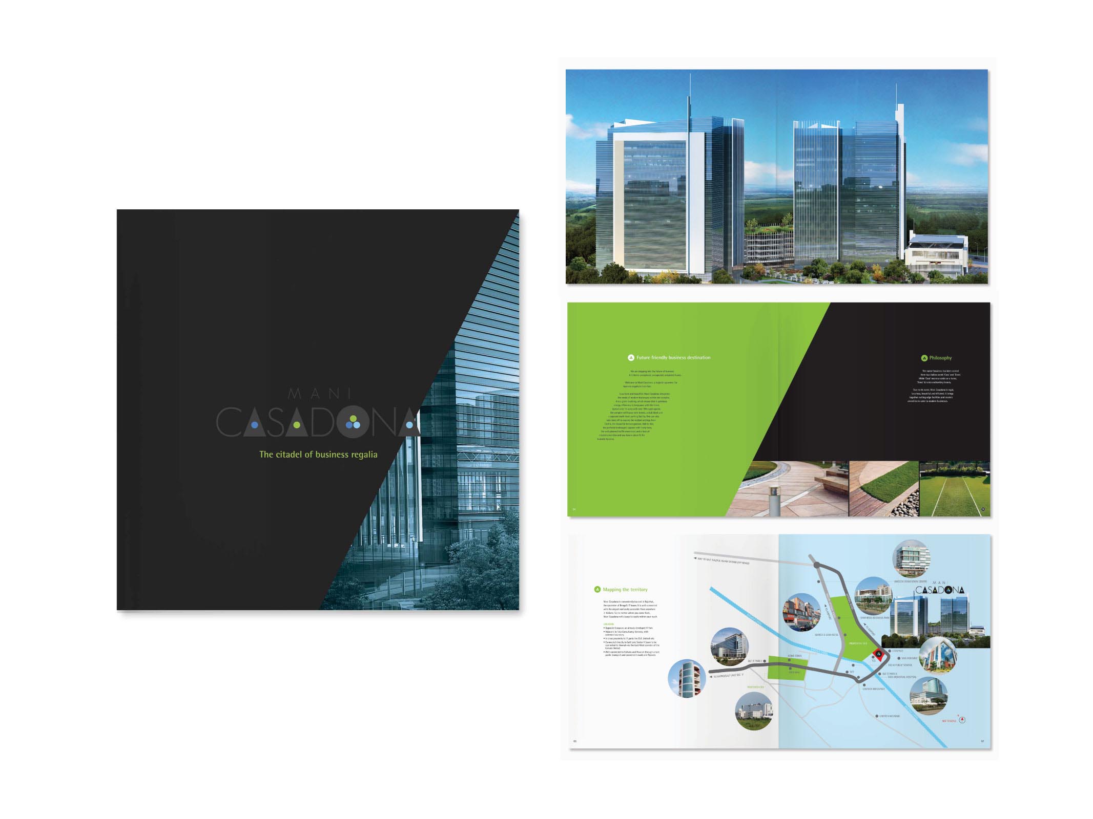Built by the Mani Group, Mani Casadona is a combined business and leisure project in Rajarhat, the upcoming hub of Kolkata. A series of brochures has been created, that reflect the same refinement in both substance and style with a neat design approach which sees elements of the logo applied as motifs throughout. The corporate nature of the brochure is noticeable in its straight line templates. Seek more