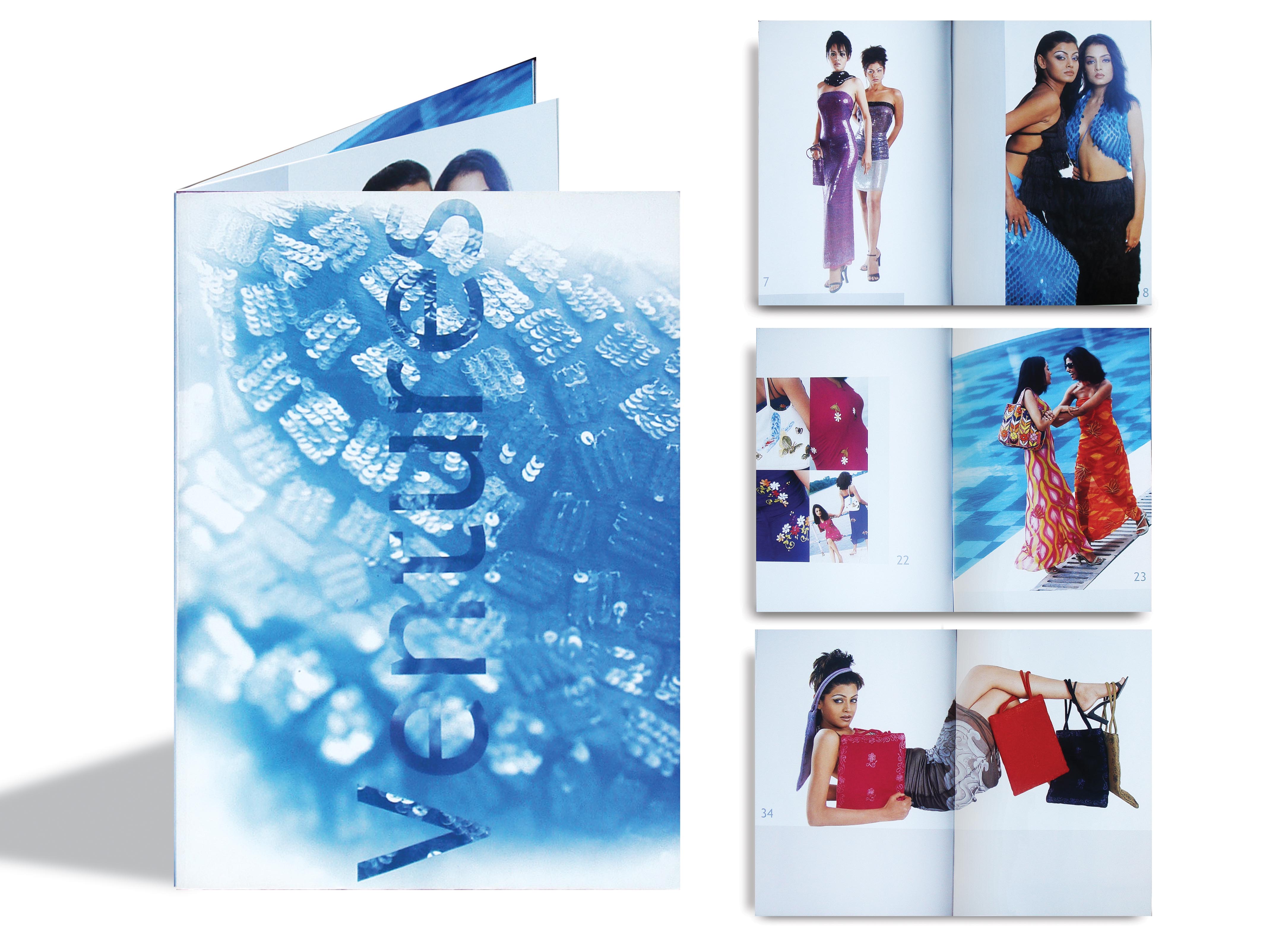 Ventures is a range of customised as well as ready-to-wear couture outfits, each piece exquisitely detailed and handcrafted. The brochure is divided by stylised section dividers and showcases the fabrics and designs as worn by models. The look of the entire catalogue is extremely minimalistic and uncluttered. Seek more