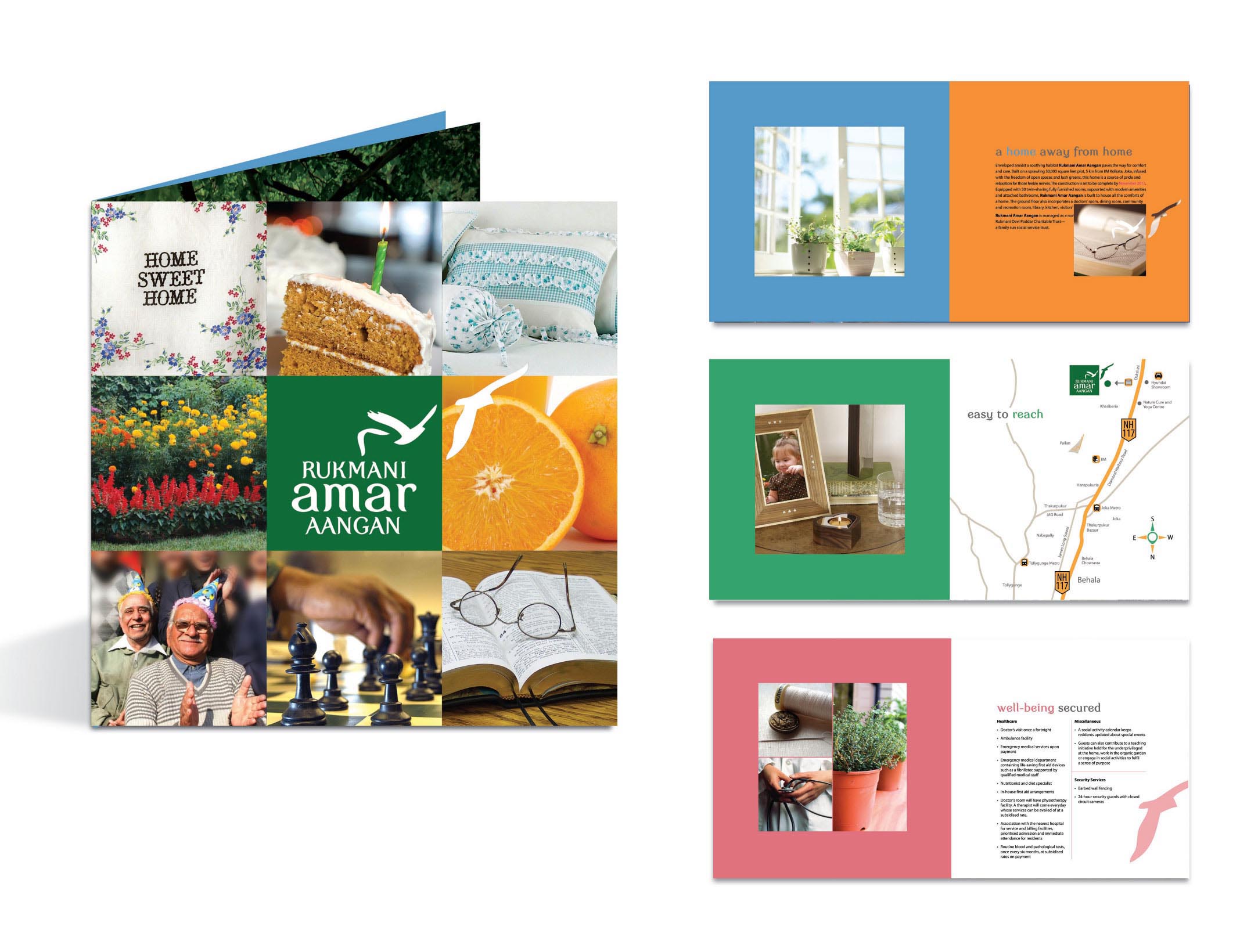 The Rukmani Amar Aangan is a first-of-its-kind senior citizens’ home located in Kolkata. The brochure created for it uses bright pastel shades with text and pictures set in an easy-to-read square grid made simple for easy perusal.