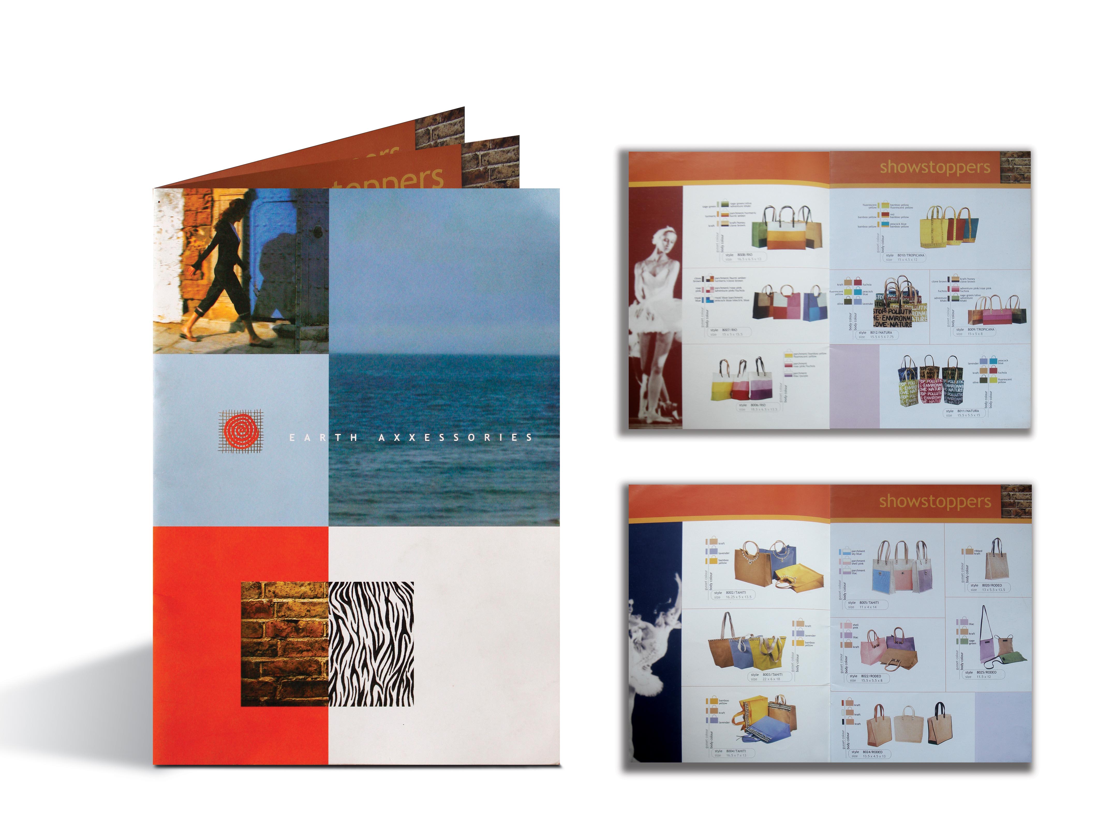 An export catalogue for Earth Axxessories jute bags. The cover highlights the natural element through visuals of the sea and outdoors. Inside each category of bag is flagged by a border with an appropriate visual.