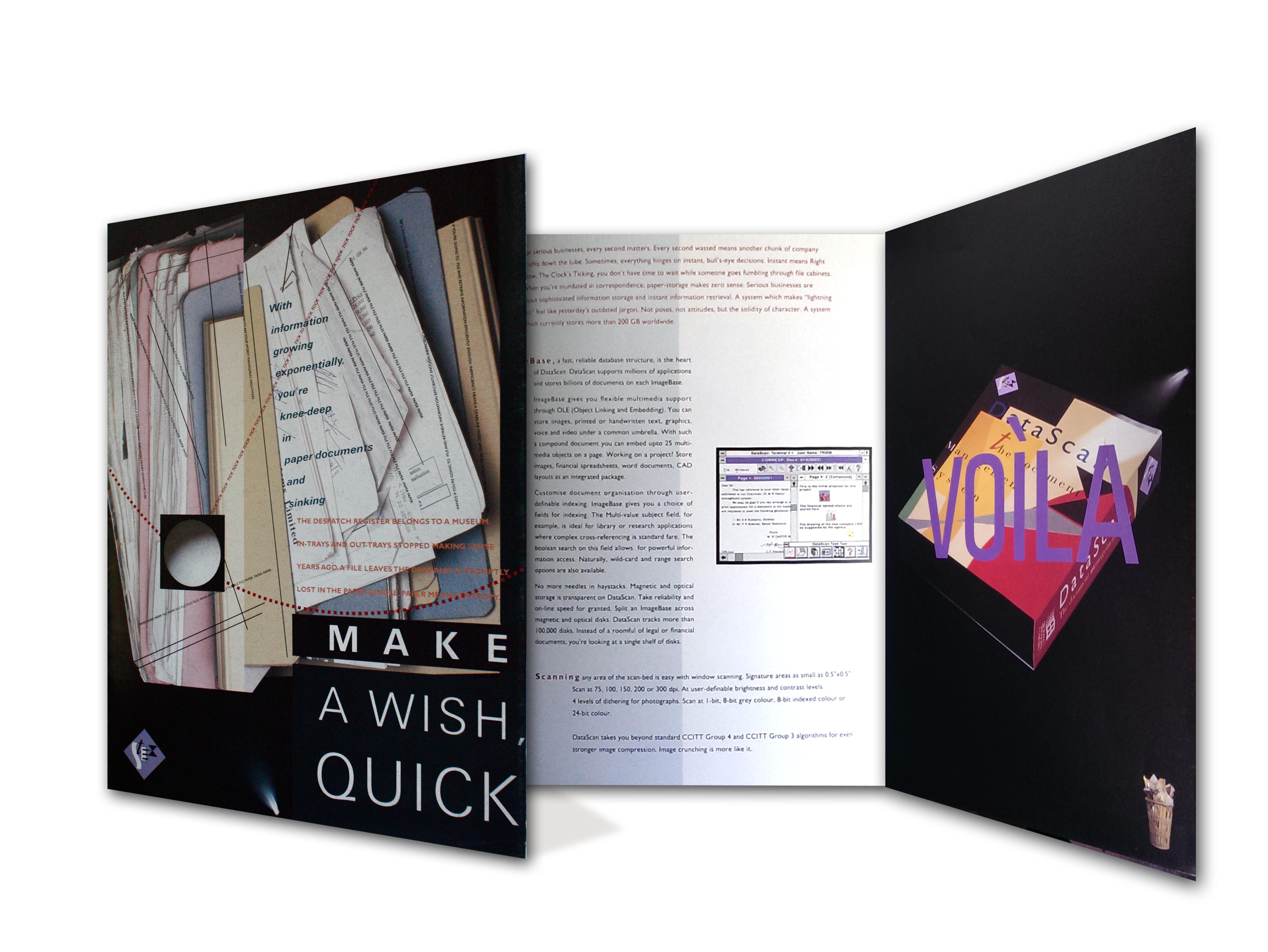 A catalogue that covers the range of Stex's business process management services. Colours are muted almost monochrome in effect, here shades of purple, grey, black and white. Seek More