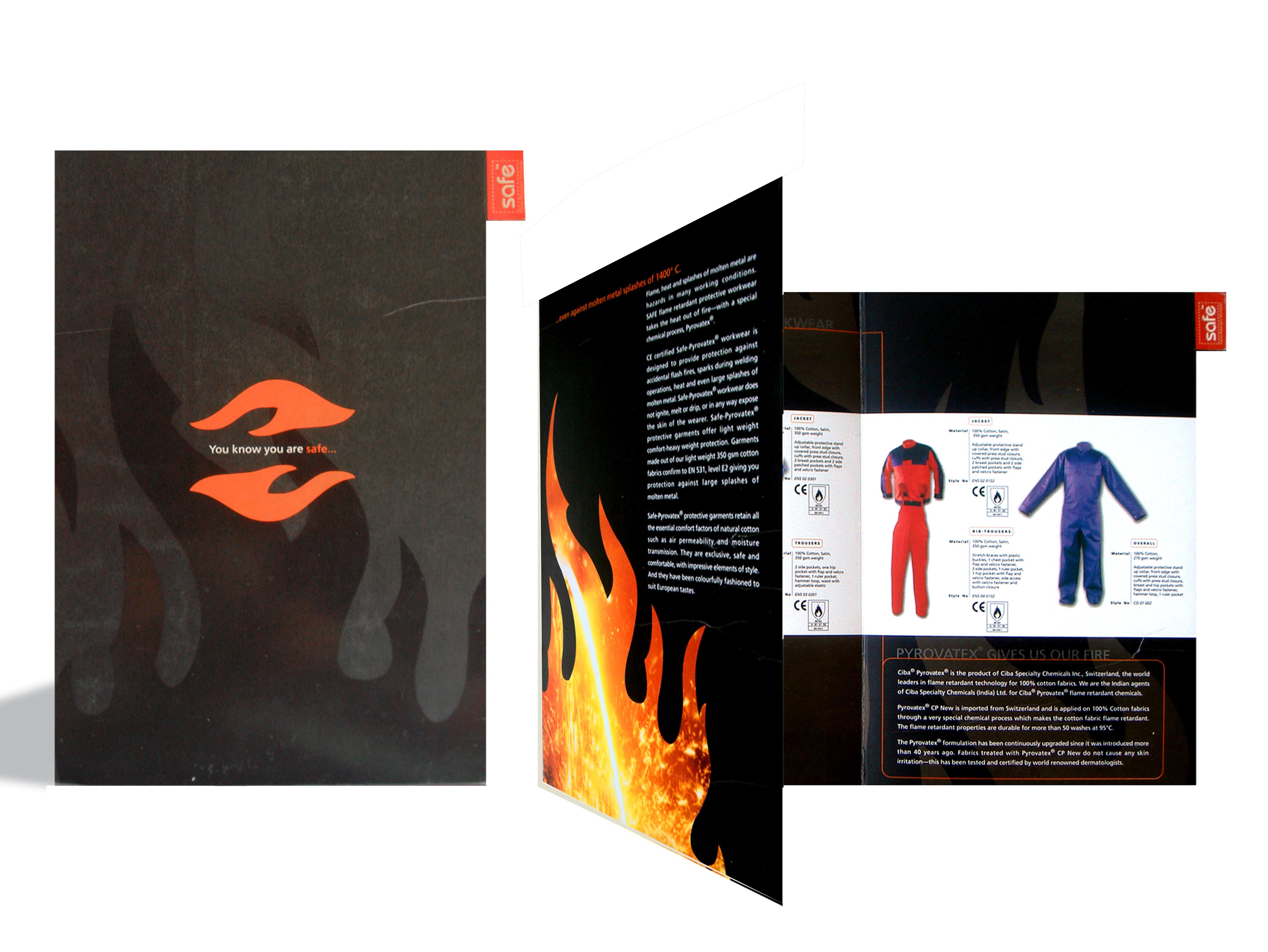Mallcom is the country’s largest integrated manufacturer and distributor of Personal Protective Equipment. The brochure uses the three elements of fire, water and earth and uses them to represent hand, body and feet protection respectively. The pages of the catalogue use colour-coded sections and a neat, grid format to present the individual products.