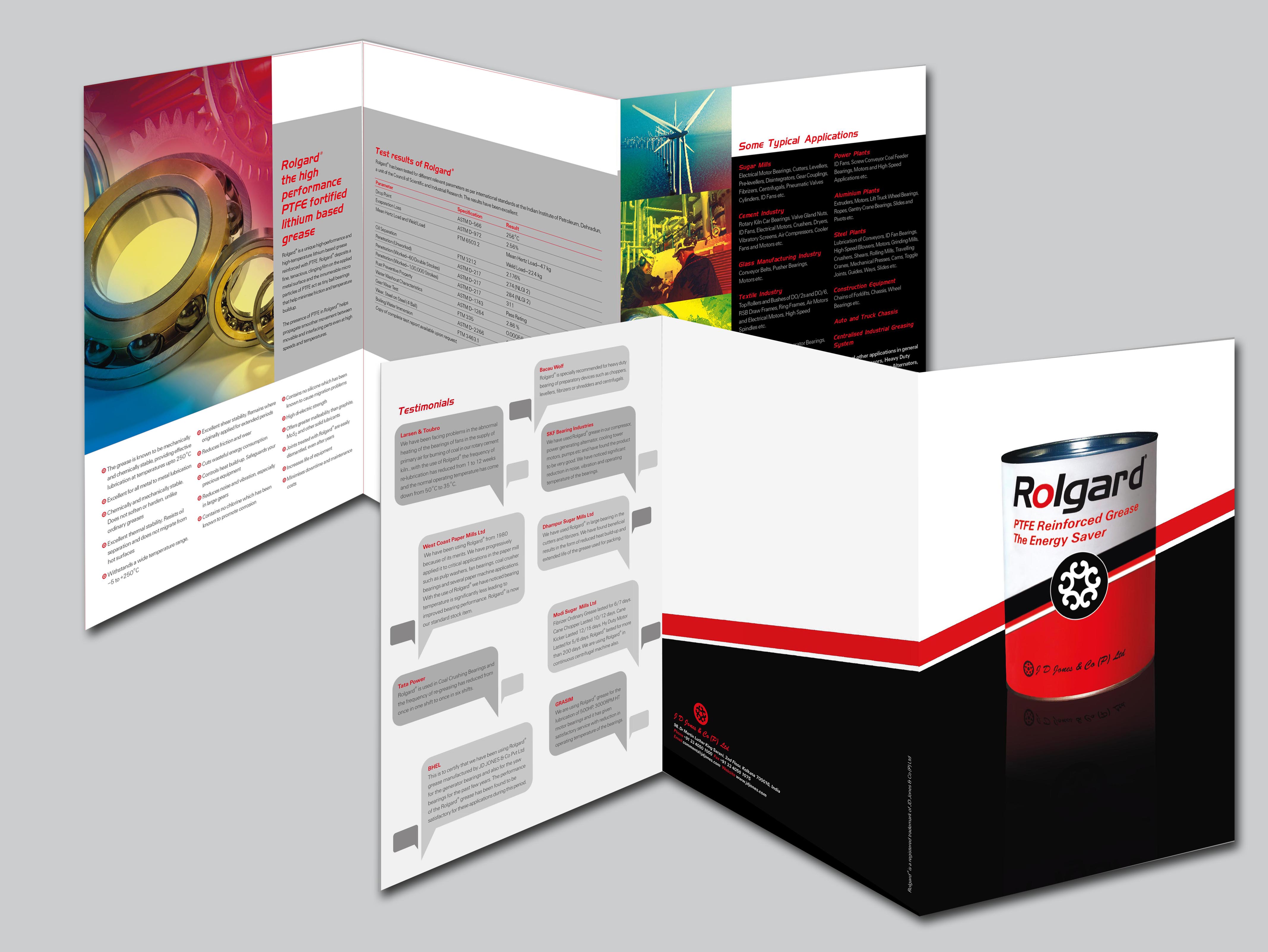 Catalogues for Rolgard Grease. Lines in the pack colours add movement to the cover. Inside colourful application visuals are set against solid panels of grey and black to create a dramatic effect.